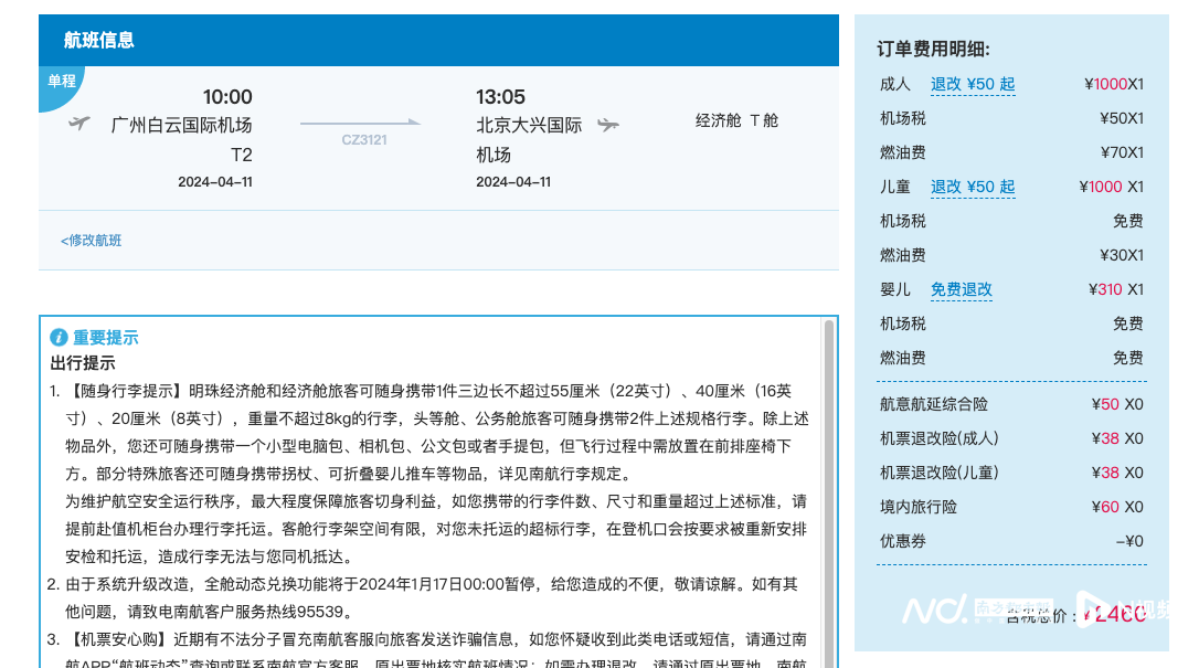 南航CZ3121航班经济舱T舱,4月11日的成人、儿童票价为1000元,婴儿票价为310元。