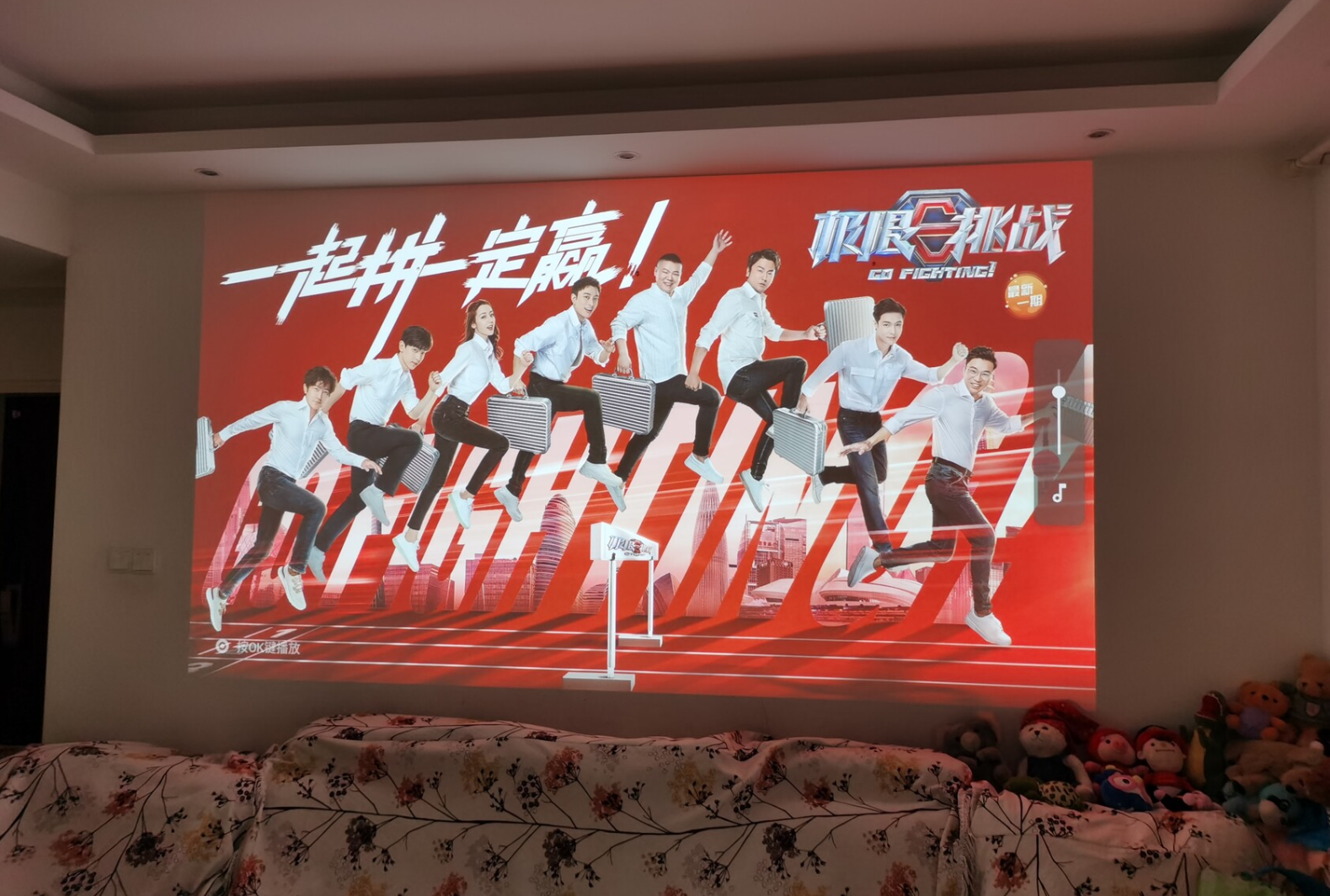 1、虽然是白墙,投射的投影画面,真的很清晰,但是每次看电视都需要坐在地上看,难免有点奇怪,电动幕布肯定是要买了:
