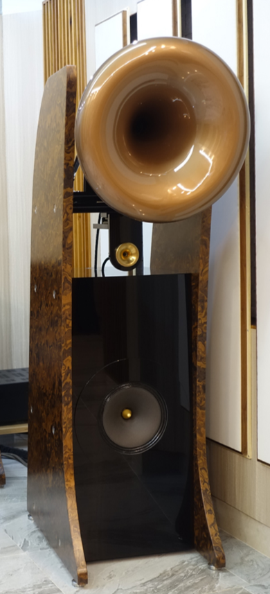 陈先生去年勇敢的朝大系统迈进,换用了西塞罗四件式音箱,在三十多平方的密闭空间中,可以大声欢唱吗?当然可以,用英国AudioNote的转盘+解码系统播了几段爆棚管弦乐和节奏鲜明的爵士乐,陈先生把圆号角几乎紧靠着二侧墙摆放,仍不影响音场的完整性,定位的形体感与整体平衡。尤其让人高兴的是低音干净紧凑,量感不是特别肥大但下盘支撑良好,管弦乐团的规模感;安定感、动态起伏都是大音响系统该有的样子。用号角来欣赏萨克斯风、小号等铜管乐器果然精彩,气流喷洒金属味十足。陈先生谦虚地说自己不懂调整,代理商来安装后就没有动过了,他只负责开心地听音乐,半年多来声音一天比一天熟化老练,他也越来越高兴。