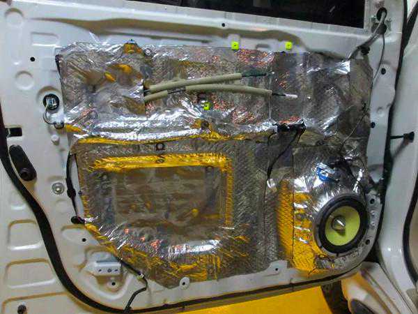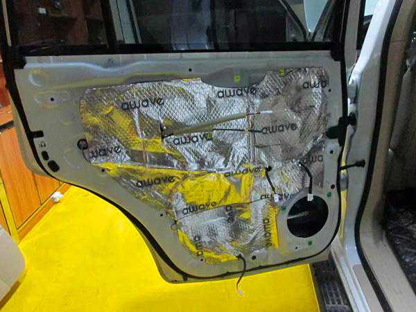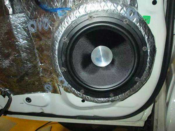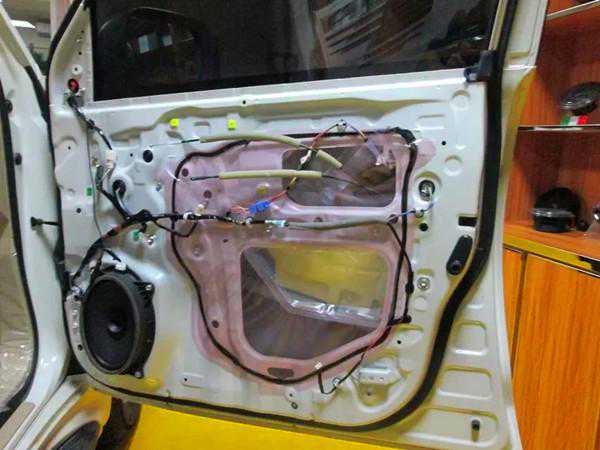 巡洋舰拆开门板内部已有一层塑料防尘罩撕掉防水膜,用干净的毛巾擦拭干净,然后再做隔音车门隔音处理之后车门钢板上的孔洞被隔音材料完全密封了,使车门形成了一个类似于音箱的箱体,为喇叭提供了一个更理想的工作环境,降低了因共振引起的谐波失真,声音会更干净有力
