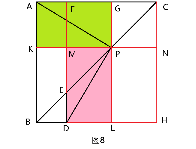 解题思路(9):补全等腰Rt△ABC、等腰Rt△BDE得到正方形ABHC(图8),过点P作平行于AB、AC的直线分别交正方形边长于G、L、K、N;过点E作EF⊥AC交KN于M。