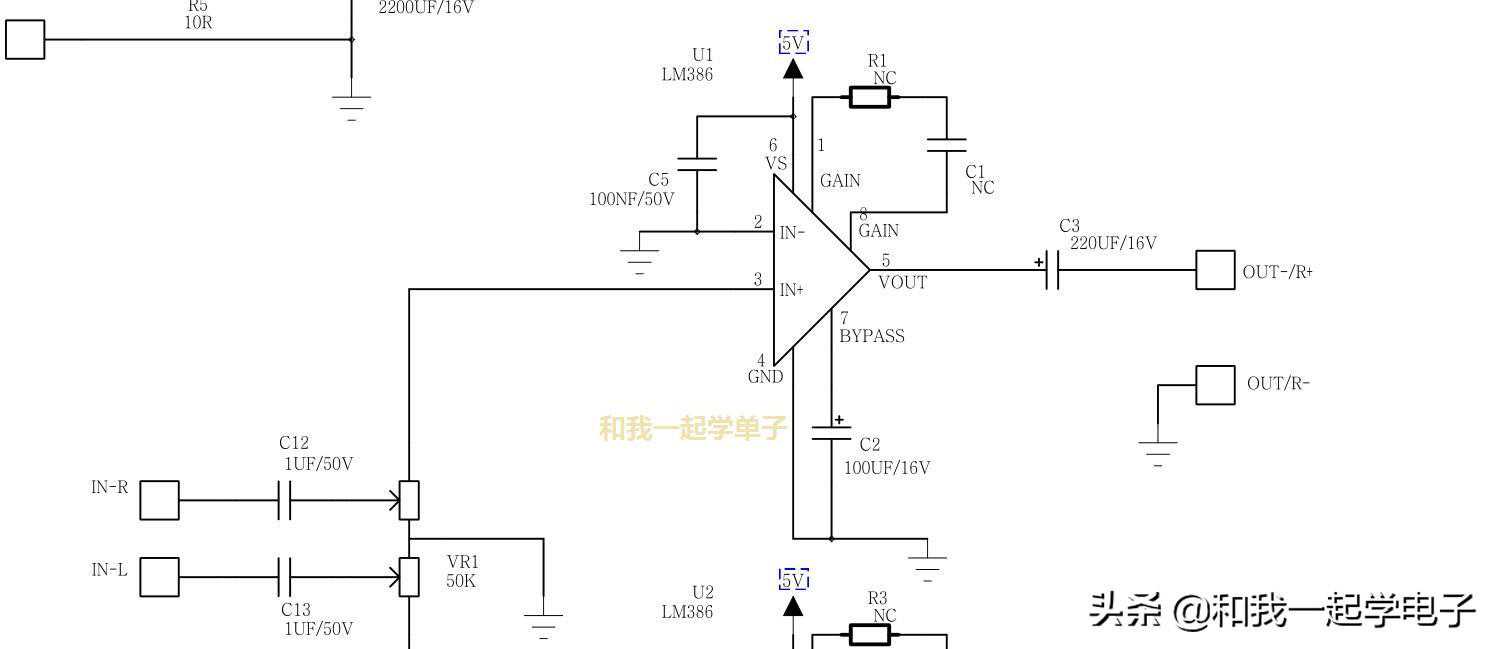 放大部分-参考数据手册设计,C12为输入耦合电容,起隔直通交作用;VR1为双联可调电阻(电位器),实现左右通道的音量大小同时调整作用;R1和C1为放大倍数设定作用,经作者实测,无需连接即可到达较适合的音量,故不接(NC为不接的意思,LM386内部已经确定最小放大倍数为20);C2为旁路电容,为减少底噪和上电对喇叭的冲击;C5为去耦电容,提升芯片抗电源干扰能力;C3为输出耦合电容,耦合放大后的音频信号;