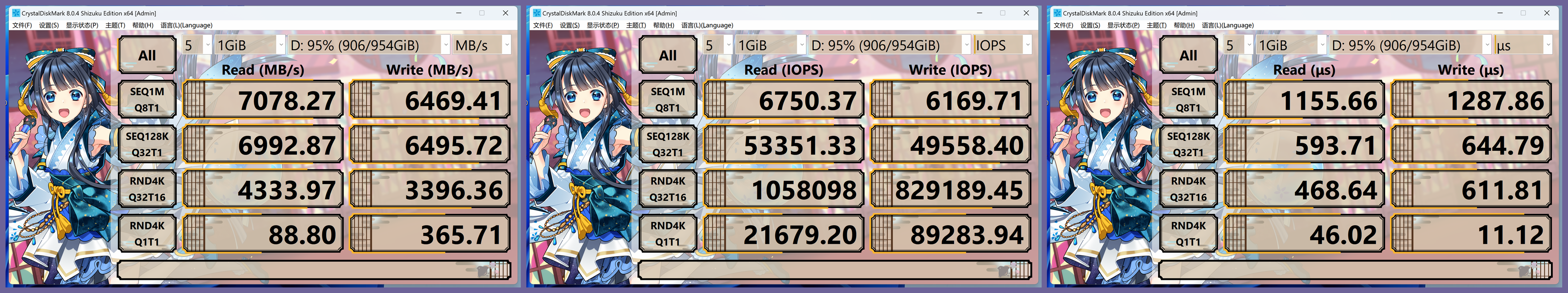 95%满盘状态下,金百达KP260Plus的顺序读取速度为7078MB/s,顺序写入速度为6469MB/s,与空盘状态相比并没有发生明显的性能下降,并且在如此高占用的情况下也没有出缓的痕迹。