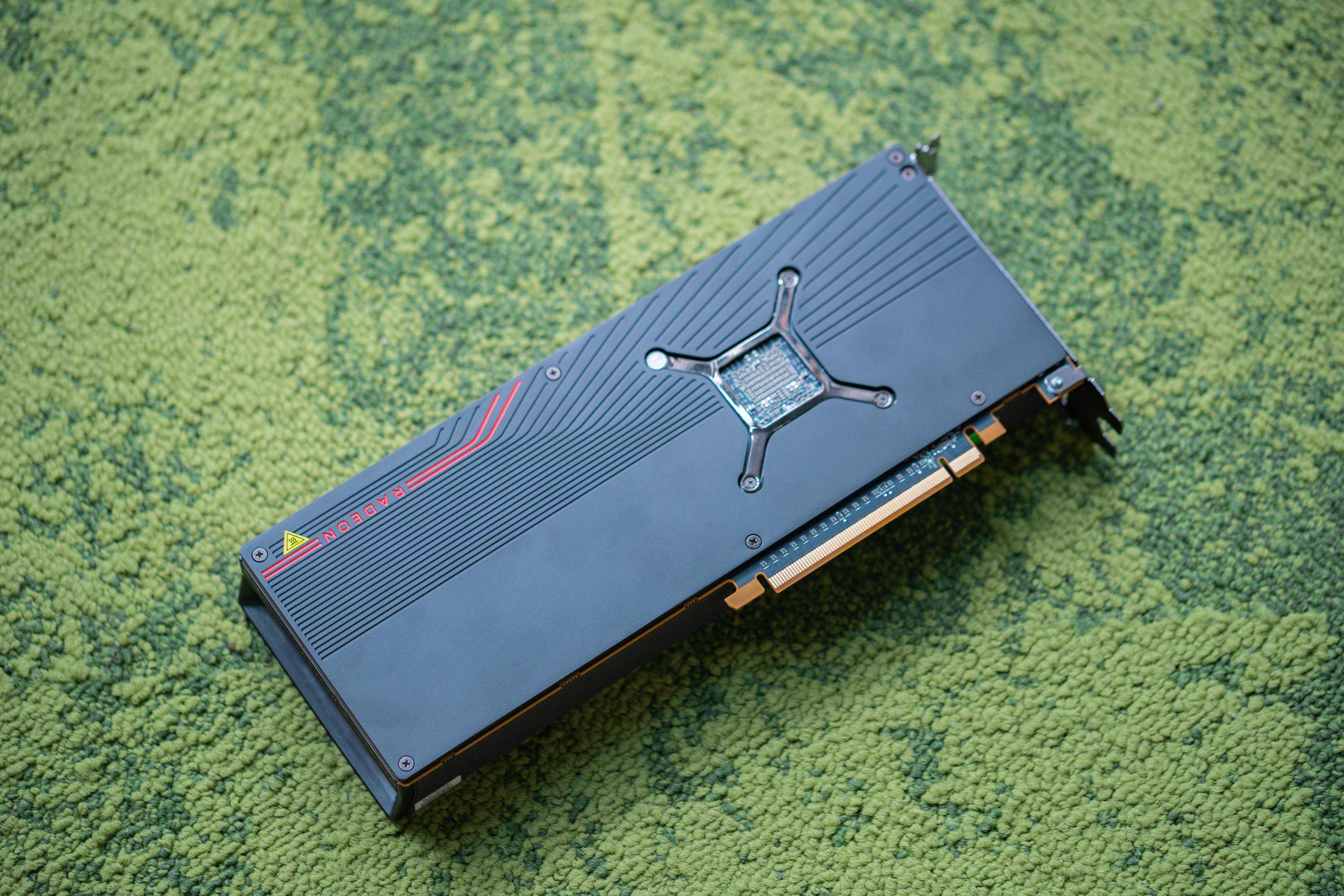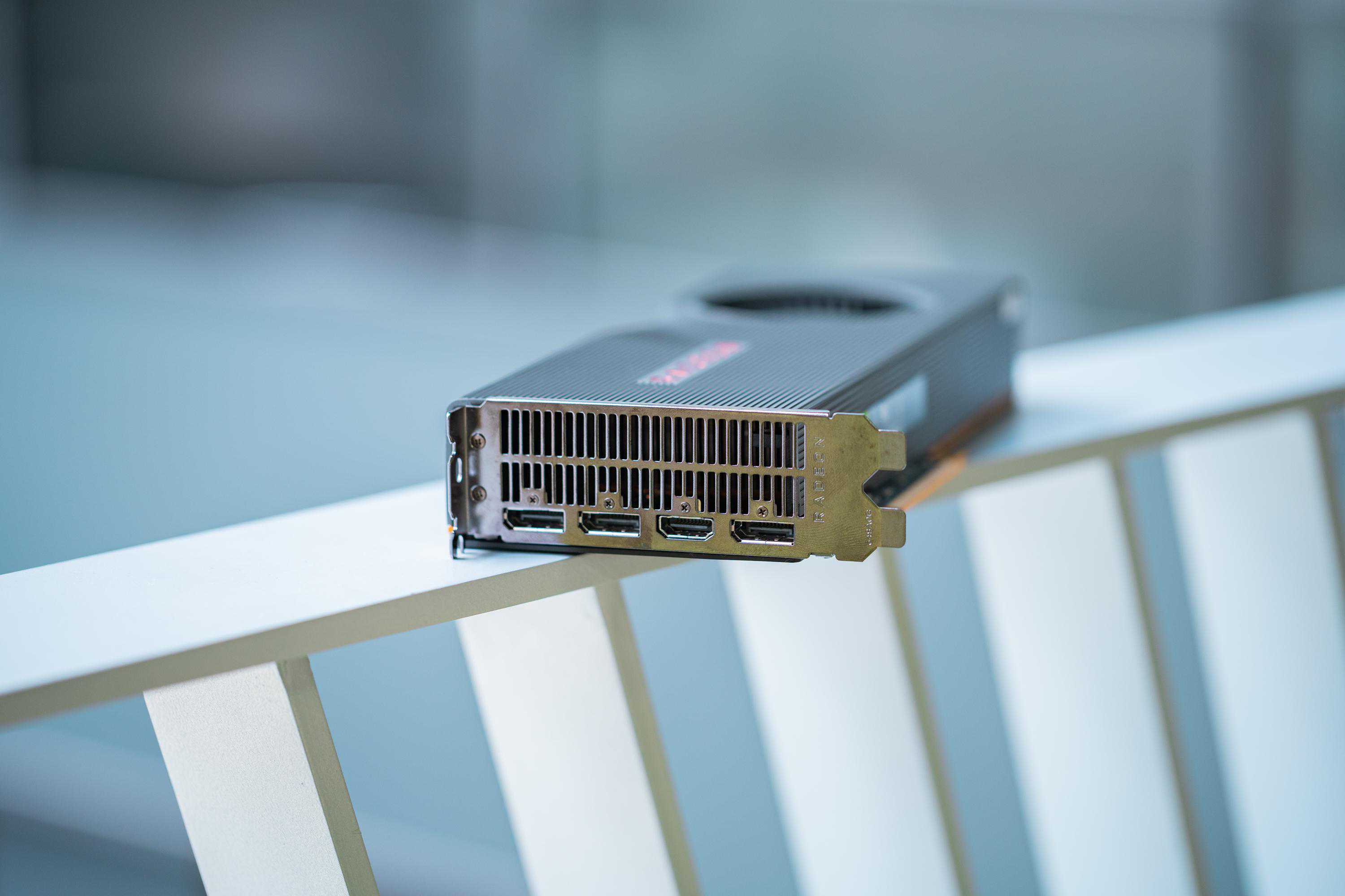 公版5700XT采用涡轮散热设计,外观相较于方方正正的5700显得很有质感,材质虽然都是铝合金,但是表面的RadeonLogo和线条处理,加上苏妈亲手捏出来的凹陷,再搭配顶端的红色信仰灯,可以说这款卡满载着A粉的信仰。