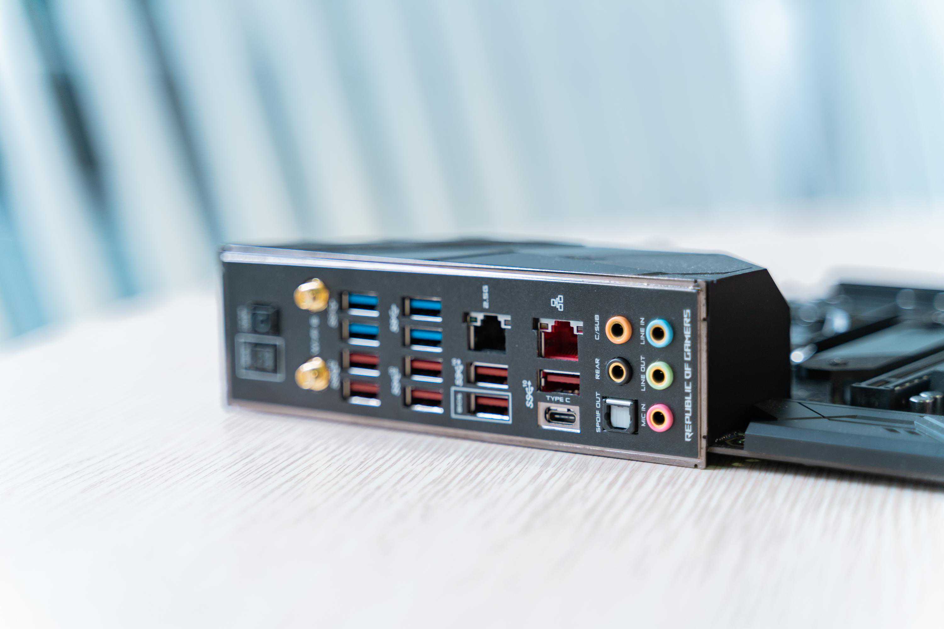 ROG自带超厚散热装甲和RGB灯的一体化I/O背板,Wi-Fi6协议无线和2.5G双网卡设计,USB接口数量足足有12个(其中一个是USBType-C接口)。
