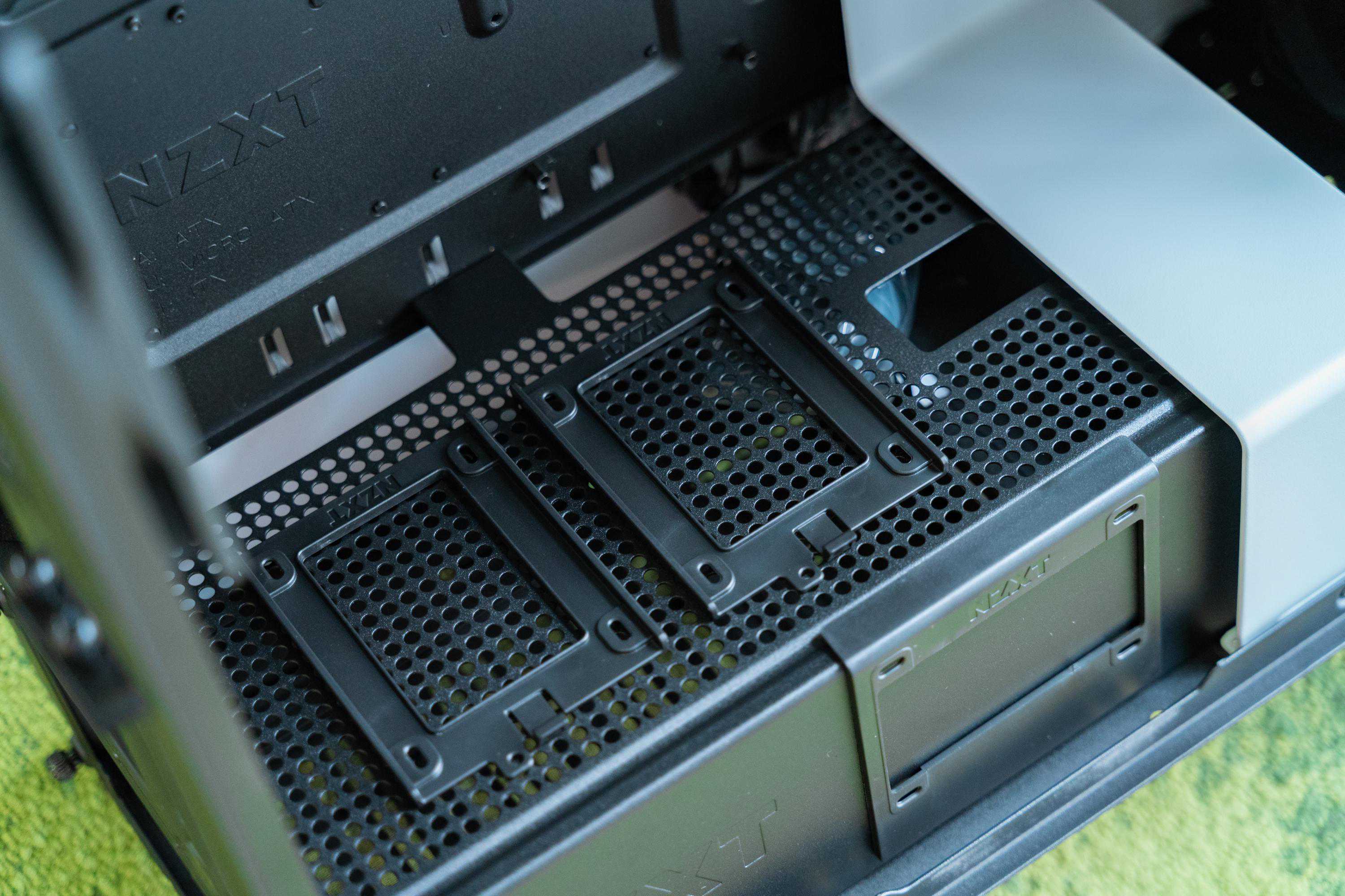 这款机箱带有7个2.5英寸和4个3.5英寸硬盘架,7个2.5英寸的都是简易SSD安装托架,不需要工具和螺丝。