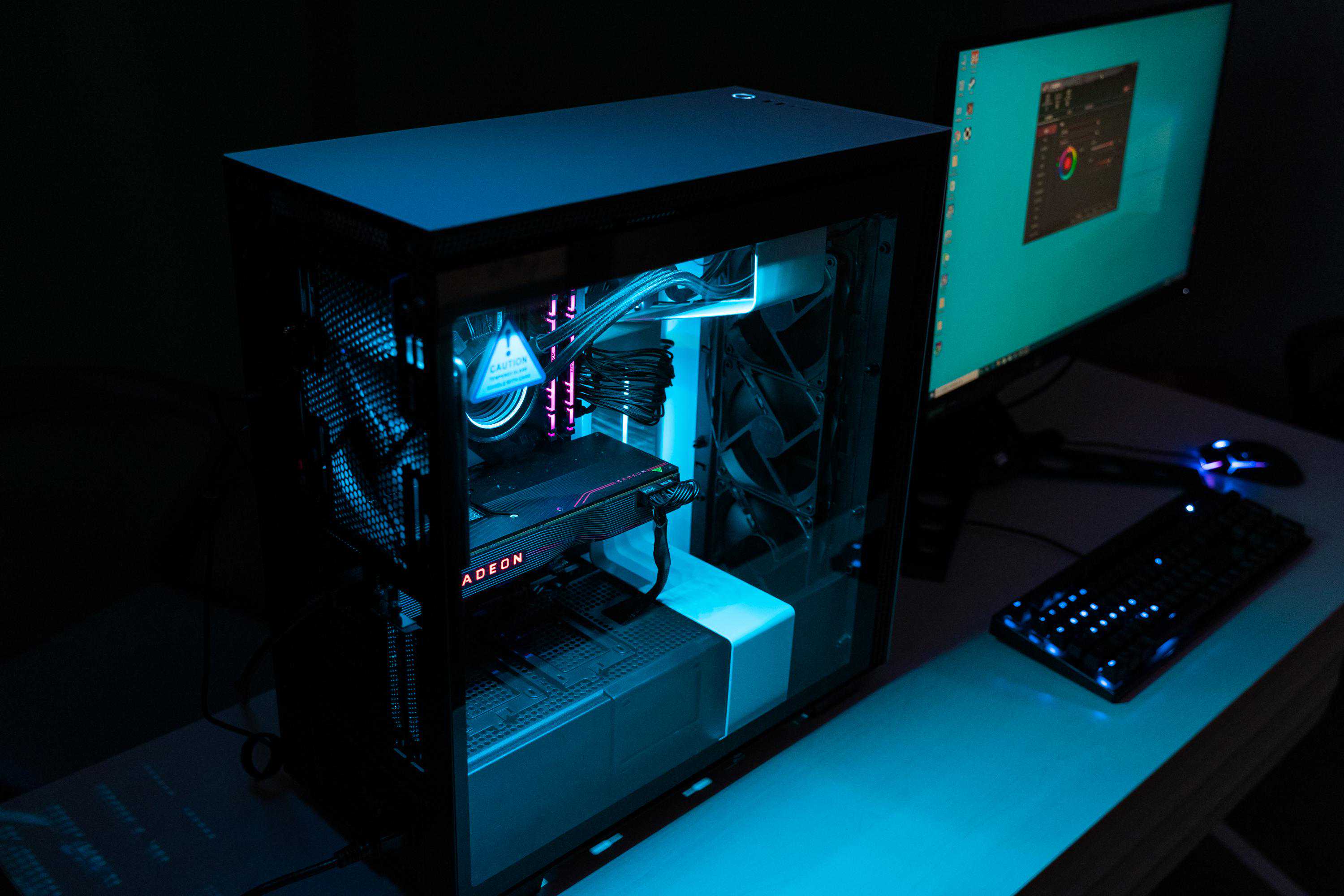 通过这个角度基本可以看到本次攒机的所有发光部位(除了电源):H710i机箱自带的LED灯条、x72冷头、HyperXpredator内存、C8H的I/O散热装甲及南桥散热,还有Radeon红色信仰灯,其实除了显卡信仰灯都是RGB的,不过我是不喜欢跑马灯光污染的,就全部调成了青色,在黑暗中显得深邃幽静——只有那一抹醒目的红色信仰。
