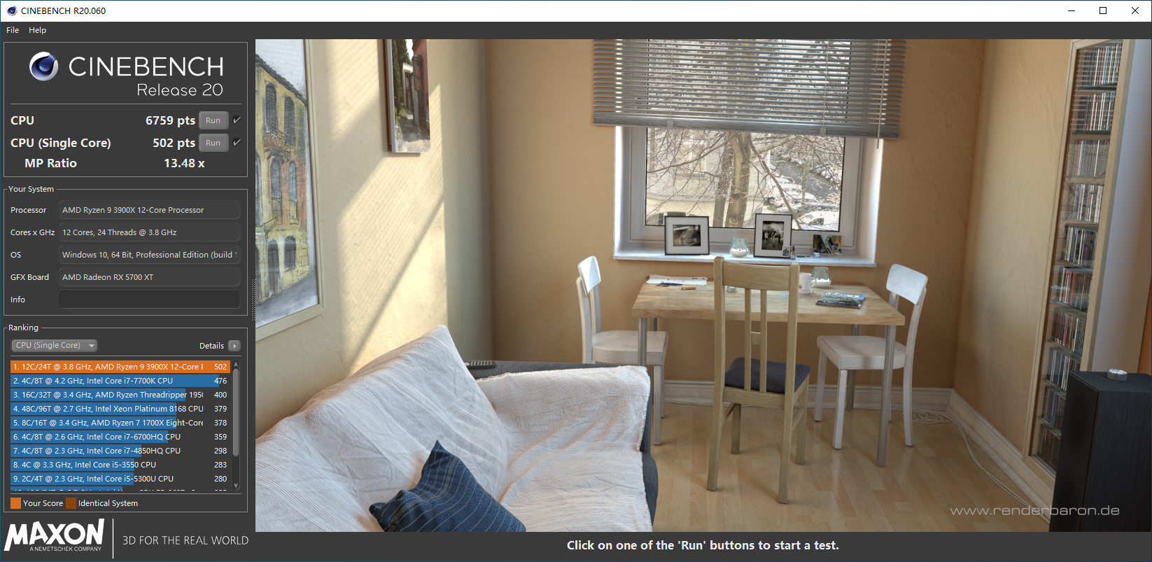 CINEBECHMARKR20测试,我手里这块3900X的单核得分为502分,多核得分是6759分。