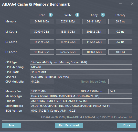 再用AIDA64来测试内存读写,本次金士顿HyperX掠夺者DDR43600(17C)8GBx2内存在3900X平台下的读取速度为54761MB/s,写入速度为52631MB/s,内存延迟为69.3ns。