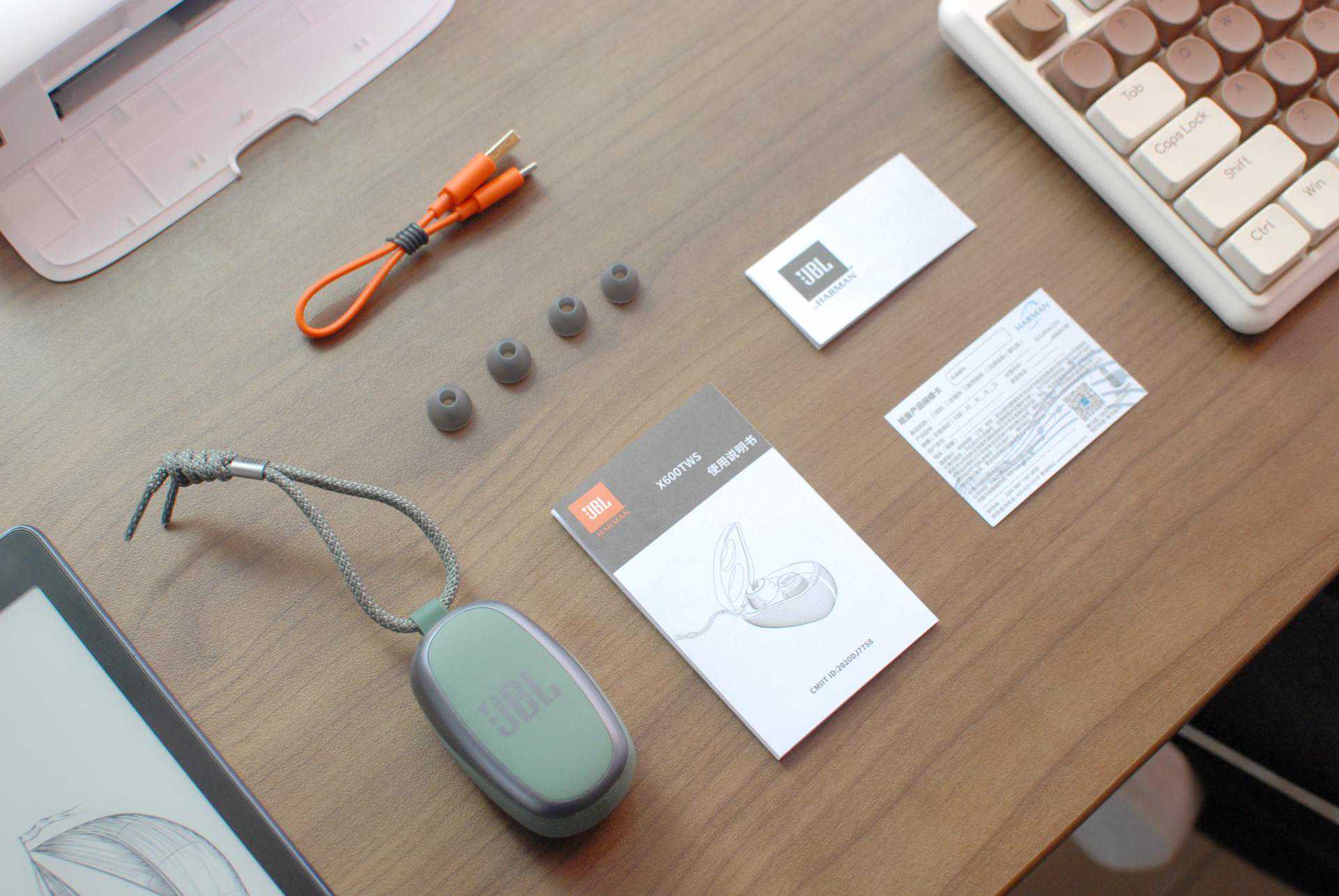 JBLX600TWS真无线运动耳机的全家福展示,随机配备了两套不同规格的硅胶耳帽,方便用户更换以适应自己的耳廓。另外,还有一根质感不错的Type-C充电线,主流的接口配备日常充电很方便。