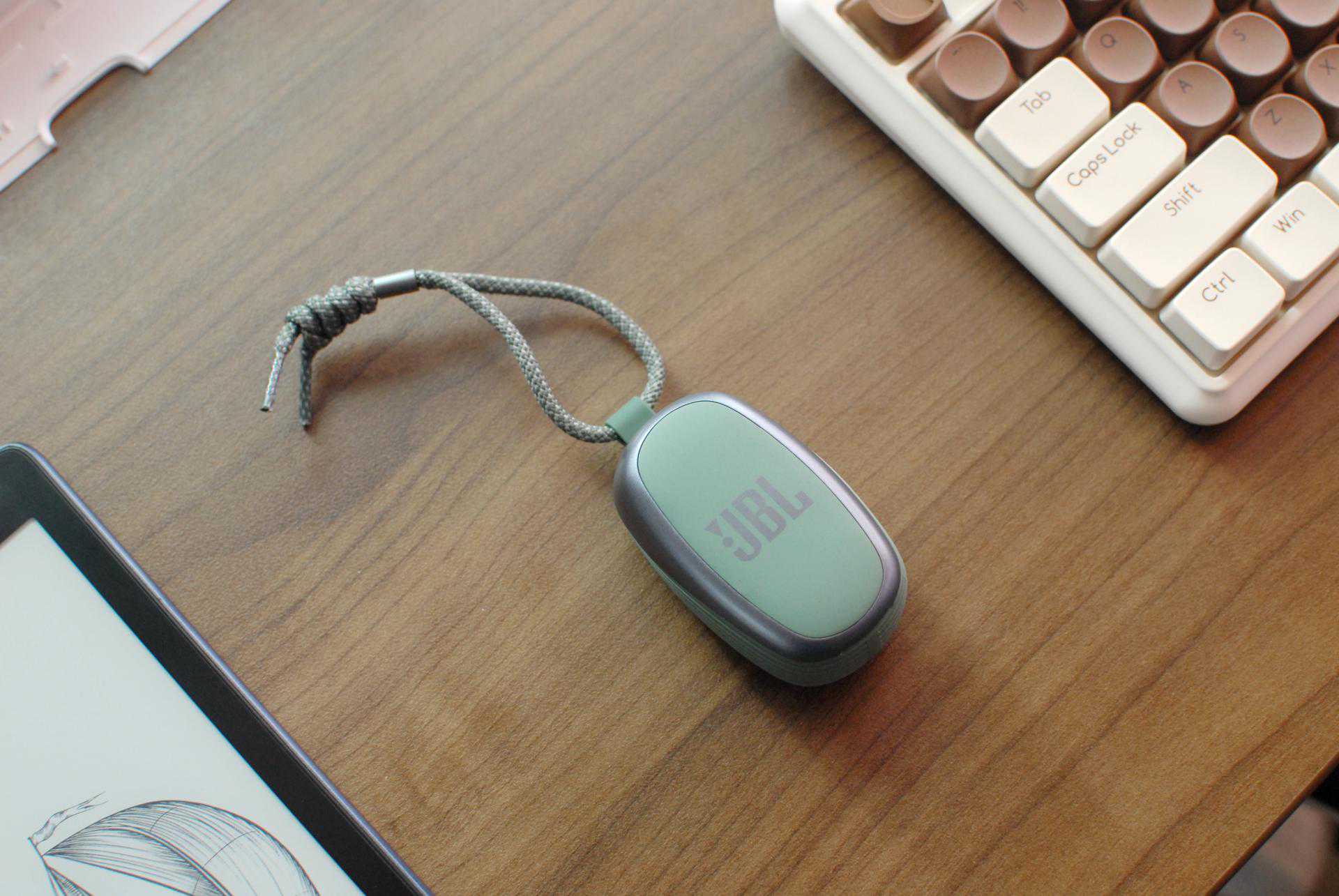 充电盒上配备的挂绳,可以说相当的贴心和实用,日常运动时可挂于背包或者系于腕上,避免无法安放的尴尬,可能有小伙伴会问会不会太重影响运动?别担心,整机只有57g的重量,不会对出行和运动造成负担的。