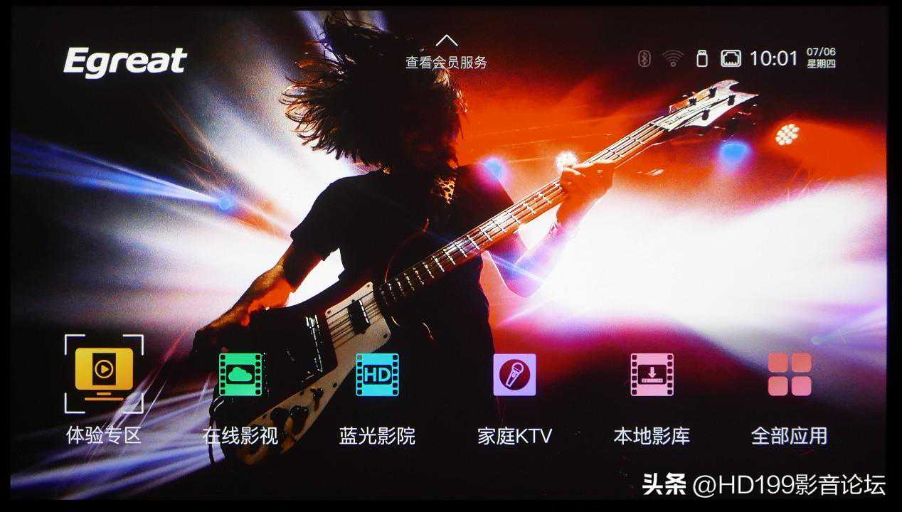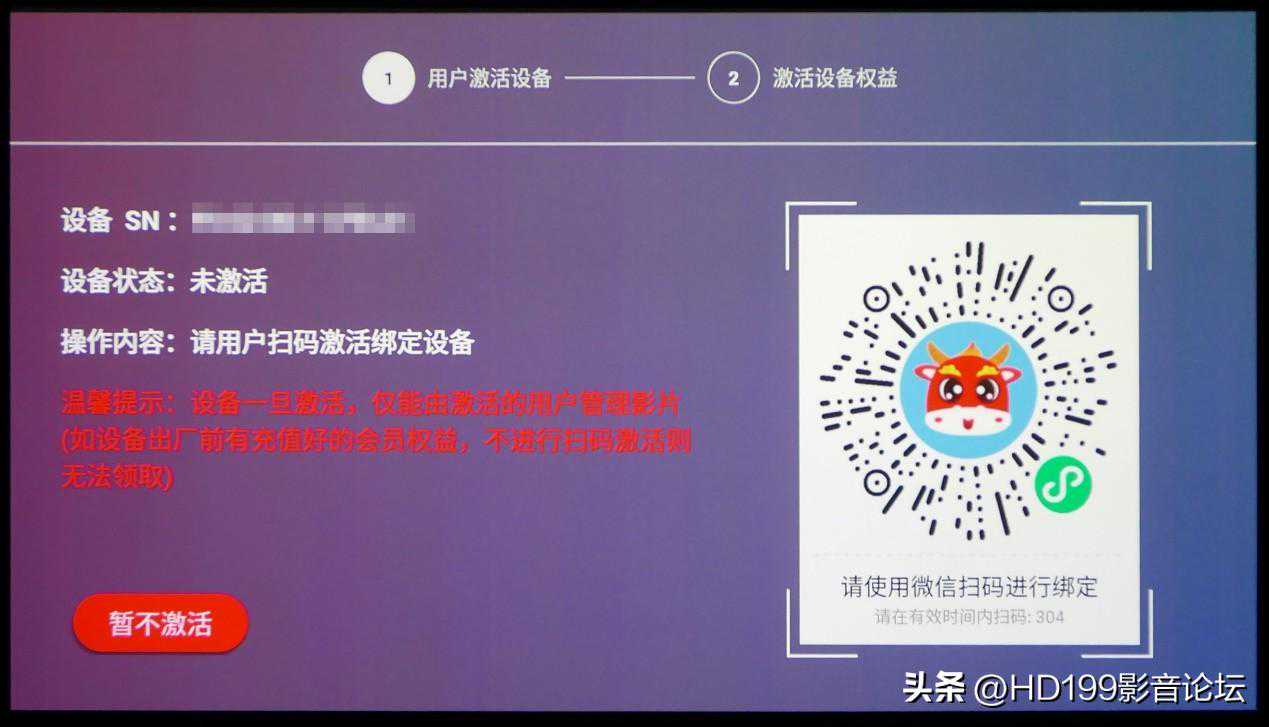 接下来开机试用,进入主页面有六个大版块:体验区、在线影视、蓝光影院、家庭KTV、本地影库和全部应用。其中前几个板块是需要连网使用,出厂自带一年的在线影视蓝光影院的联合会员,第一次进入时用微信扫描激活即可。