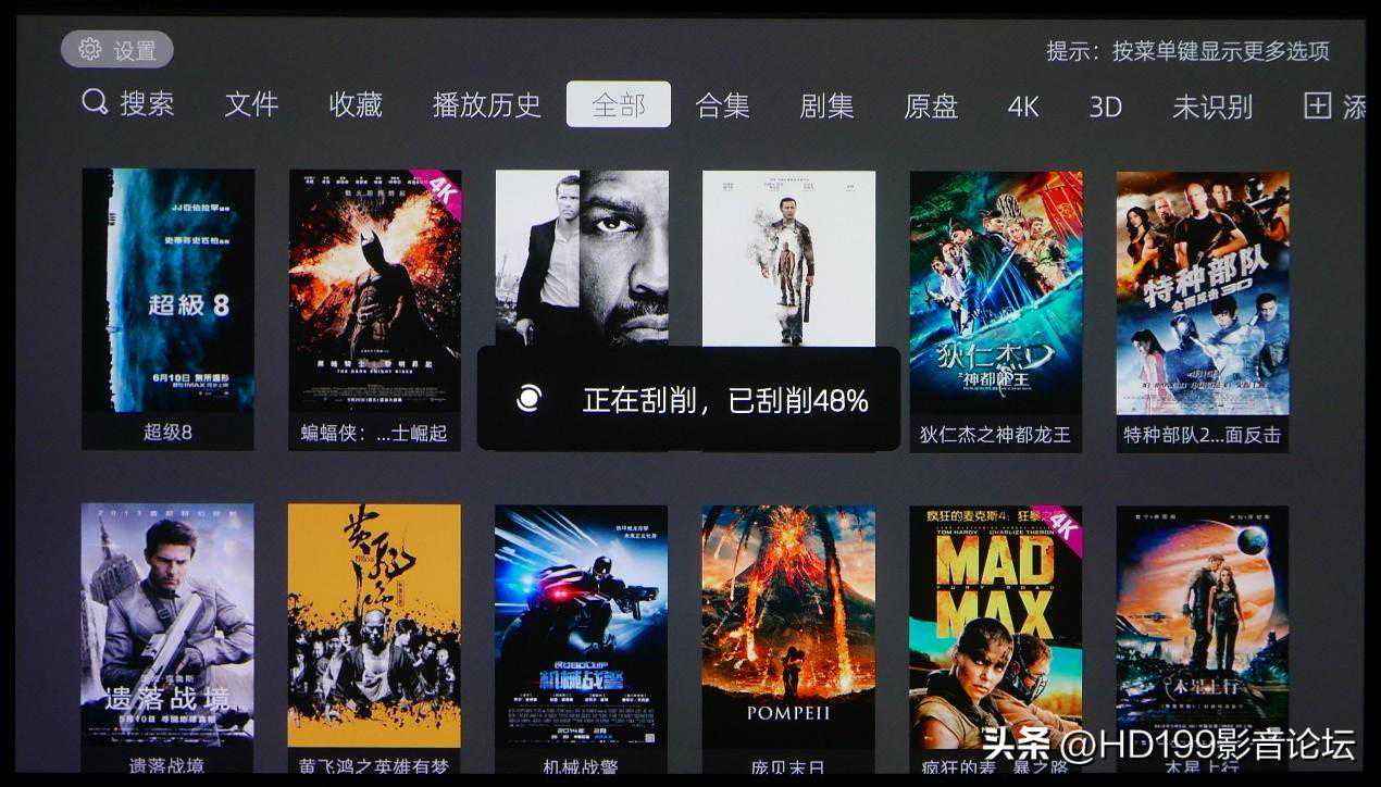 最后还有【本地影库】,就很好理解了,可以播放一些下载好的本地文件(支持外接硬盘、U盘和NSA局域网共享),它自带海报墙功能,只要配置好文件路径,就会自动开始刮削,扫描和匹配的速度也很快,识别率还不错。即使有少数识别不好的影片,我们也可以手动修改编辑。