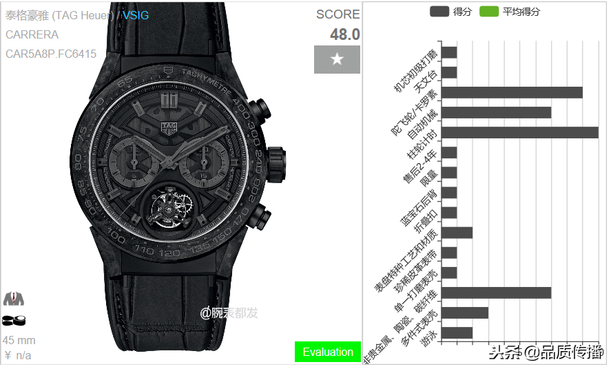 前面的泰格豪雅(TAGHeuer)碳纤维陀飞轮幻影,采用了钛合金表壳中段与碳纤维表圈和表耳的组合,这得益于其多件式表壳结构。而且防水达到100米。