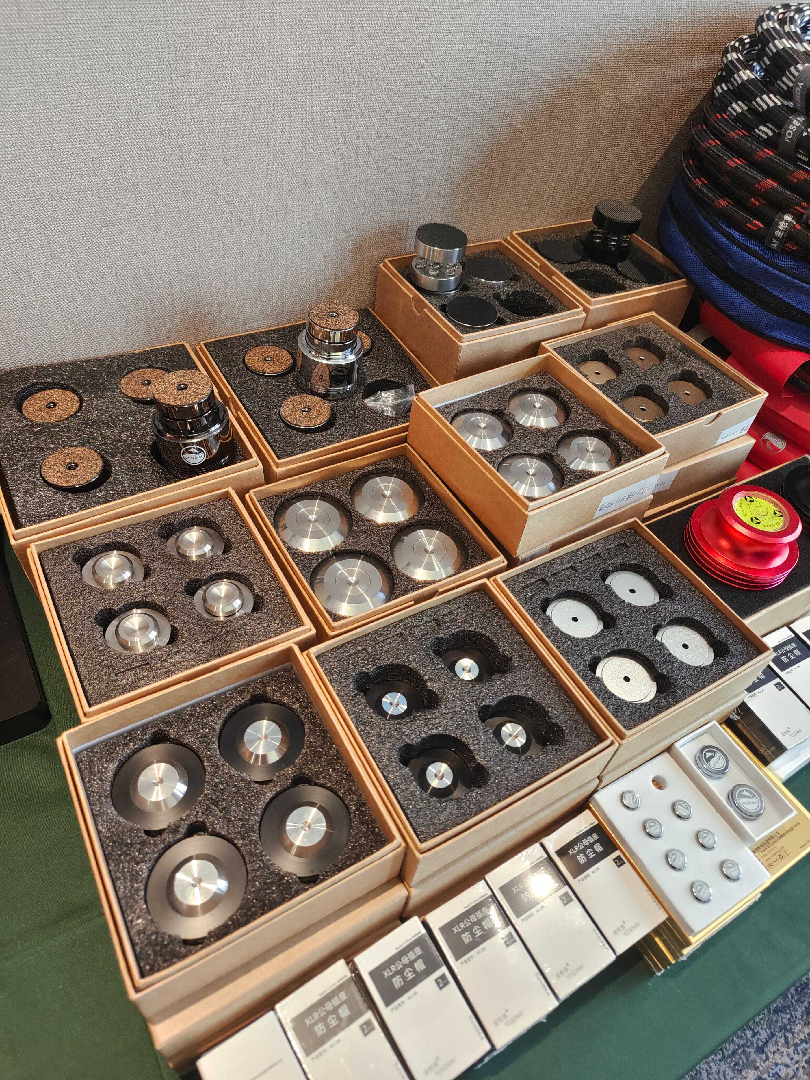看到了几家卖线材和脚钉的商家,问了下报价,其实我知道会很贵,但是听到报价,还是让我倒吸一口凉气,这些都是HIFI玩家们的最爱,AV玩家虽然也会注重音响周边配件的使用,但很少会像HIFI玩家那样精益求精,宁愿不计其数的投入也要追求那百分之几的提升,系统搭配的任何一道关卡都必须武装到牙齿。