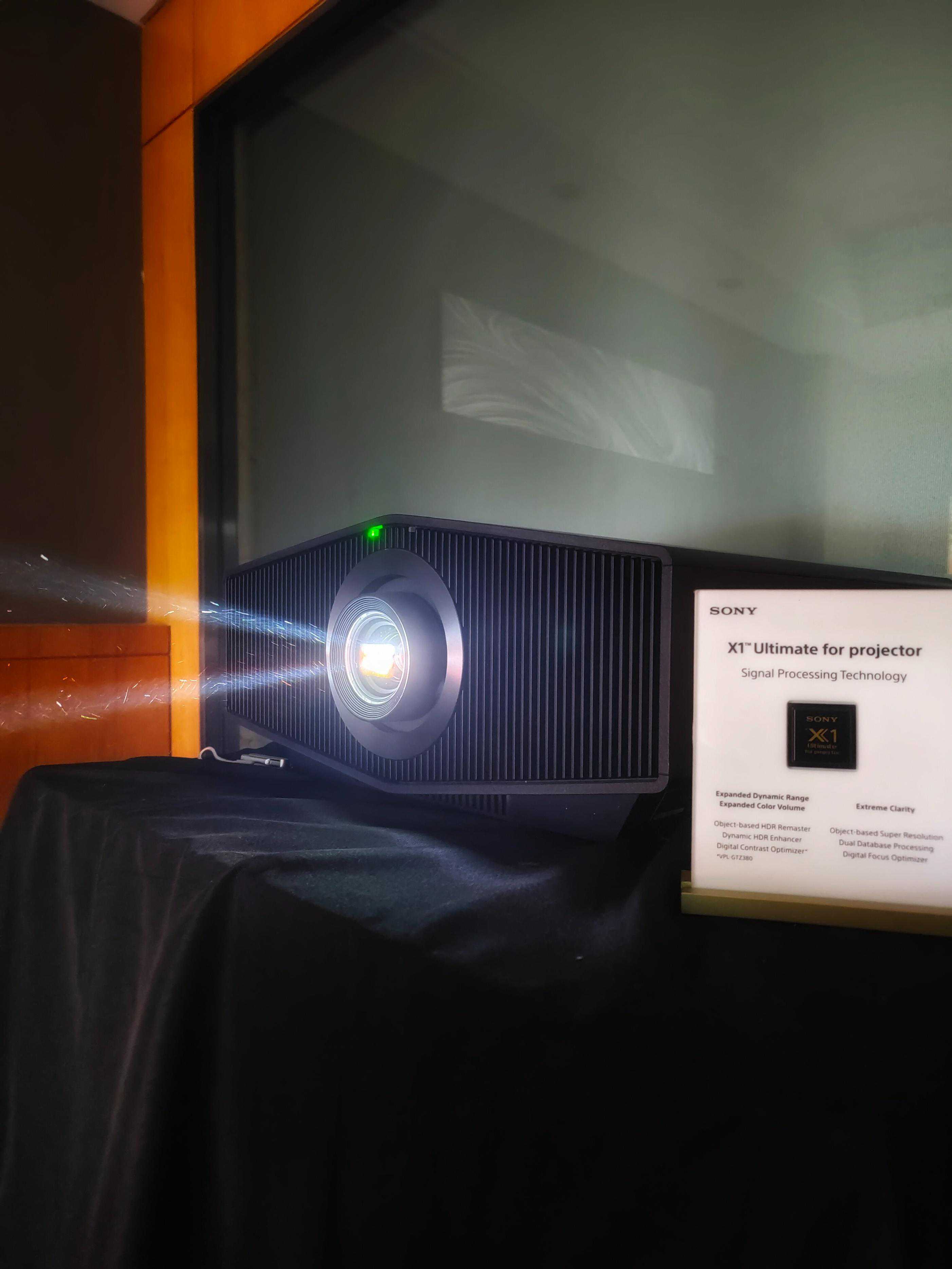 原以为第二层也没啥看点准备去第三层的时候,突然发现一个展示区门口人头攒动,好不热闹。好奇心促使我迎了上去,走近一看,发现是SONY经销商,正在展示投影机。内心小小激动了一下,问了下旁边的人展示的什么机器,他说才出的4K激光,十几万。听到这句话我有些纳闷了,SONY才出的什么机器是十几万的价位。