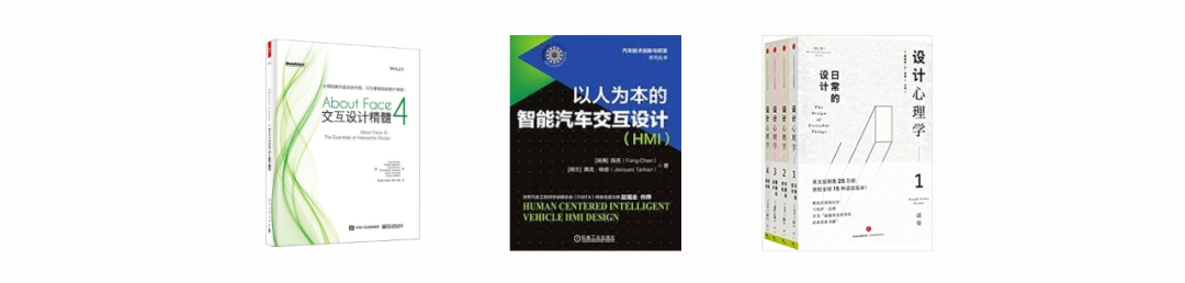 由于HMI设计发展的时间不久,所以并没有很多参阅的书籍,这里主要还是以传统的设计书籍为主,这部分书籍也属于可迁移技能的范畴。《交互设计精髓》《以人为本的汽车交互设计》《设计心理学》。