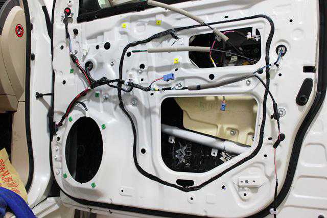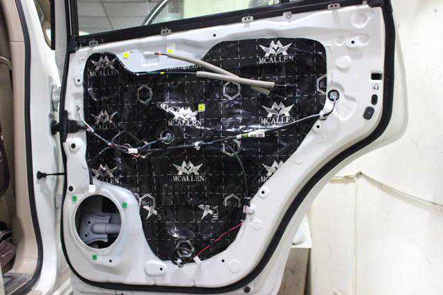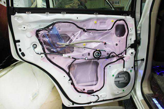 撕掉防水膜把门板的里层清洁干净,贴上我们的第一层止震板。第一层止震板能够有效的抑制车在路上行驶时车的车门铁皮带来的震动及风噪。