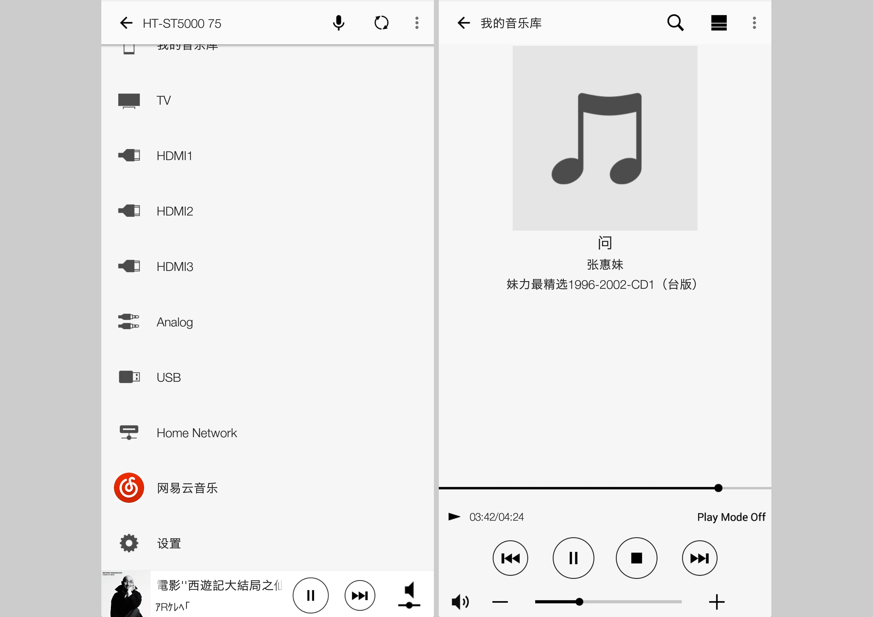 当蓝牙配对后,直接打开手机上的网易云、QQ音乐等任何一个播放器,均可通过索尼HT-ST5000播放。而此时MUSICCENTER的作用更像是一个虚拟遥控器,主要用来切换声场模式。