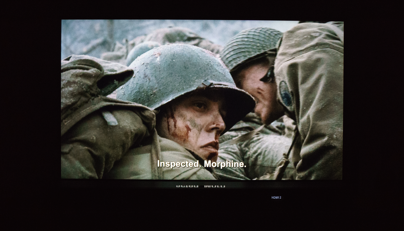 直接先试一部带有全景声的《拯救大兵瑞恩》吧。开场长达20分钟的奥马哈海滩战只能用壮烈来形容。在登陆艇上,可以感觉到炮火身边的远处爆炸,然后水从头顶降落。打开艇门时,敌方碉堡的扫射子弹从我的正面出现。瞬间各种呐喊声与子弹交织成了一片,场面一度混乱起来。断臂残肢,血液飞溅,医护兵的呼唤此起彼伏。