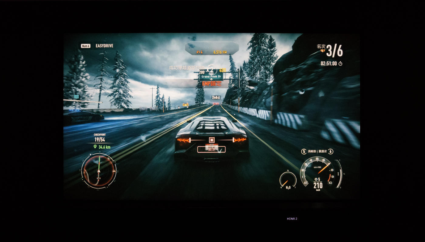 《极品飞车》的游戏画面经过索尼HT-ST5000的加持后,最直接的感受是引擎的轰鸣声充满了力量感,低音效果相当震撼。涡轮加速的层层渐进,每一次转弯时轮胎与地面间的刺耳摩擦,追捕的警笛声随着车身的摇摆忽左忽右。一个小的失误,就会感受到竞赛者的引擎声洪亮有力的从身边一闪而过。各种气候的变化也是那么的有代入感。此时的游戏体验感是成倍的增加,游戏沉浸感很强,让人热血沸腾。