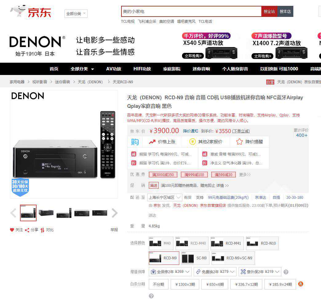 我这次来主要是想为家里用了N年已经坏了的索尼台式音响升级换代,因为是给老人用,所以还是以台式音响为唯一选择,要能放CD要能听广播。展会现场的工作人员还是很给力,立马推荐了N9。一查,好嘛,这货是日本VGP2018大奖得主,支持蓝牙、DLNA等等,算是天龙目前的旗舰机了。虽然现场可能有音质更好的选择但这个是唯一符合要求的参加特卖的组合音响。不犹豫了,买吧,1456元(仅仅主机)厂家送货到家,带一年保修。有趣的是现场给N9配的书架箱是M41的,事实是我查了查也感觉N9配套的书架箱有点弱,幸好现场可以只购买主机,这样家里没有坏的索尼原组合音响上用的书架箱又可以继续使用,即使以后不满意了换个书架箱就是了。