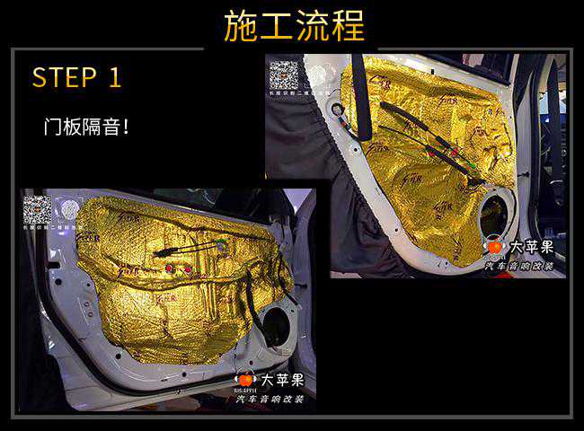 首先对车门进行双层隔音处理,内层条形贴法止震,外层整张隔音降噪。这样能让车门形成一个类似于箱体的静谧结构,不仅能够增强门板刚性,还能使安装在车门上的喇叭的音质也会大大提升!