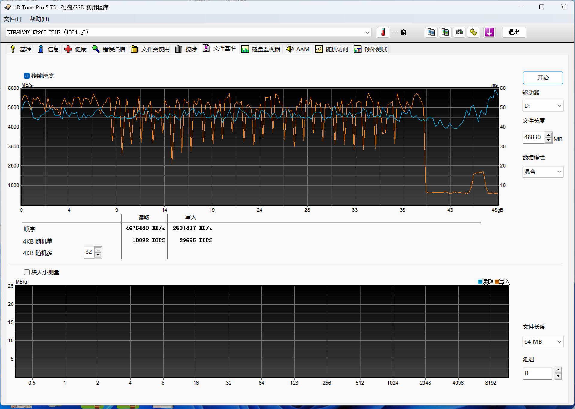 空盘状态下,金百达KP260Plus的顺序读取速度为7111.69MB/s,顺序写入速度为6547MB/s,均超过了官方标称的性能参数。