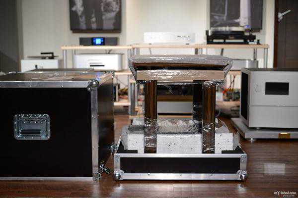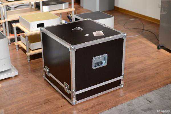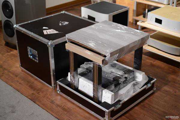 顶级音响架WoodBlock,采用坚固的航空箱运送,可以看到其已是整体组装好的,本次订的是单座双层的标准尺寸,WOODBLOCKRACK1+1,底座是500x550mm,,上层是500x500mm,整体高610mm,颜色是钢烤的BoliviaOliveveneer木纹。