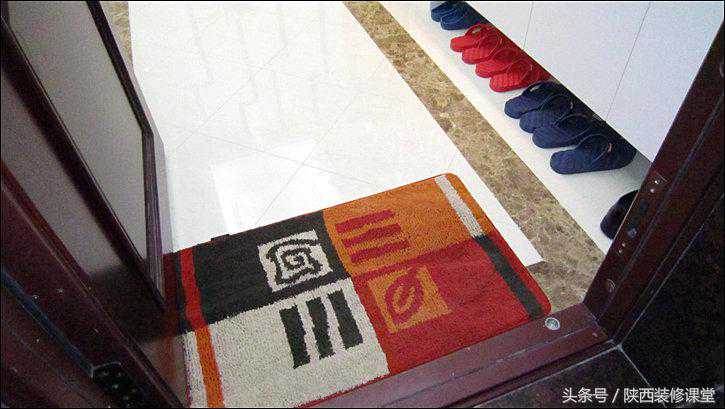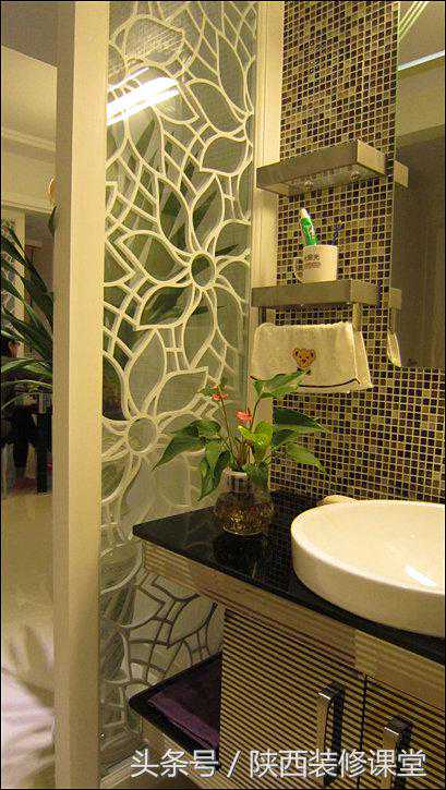 接下来我们一起看看公卫。先看专业的角度:干湿分离,门口的垫子特别选了一张65cm*120cm的,这样就可以兼顾两个区的吸水啦。隔断与鞋柜隔断是一样的图案,同样是两层玻璃夹着木通花。