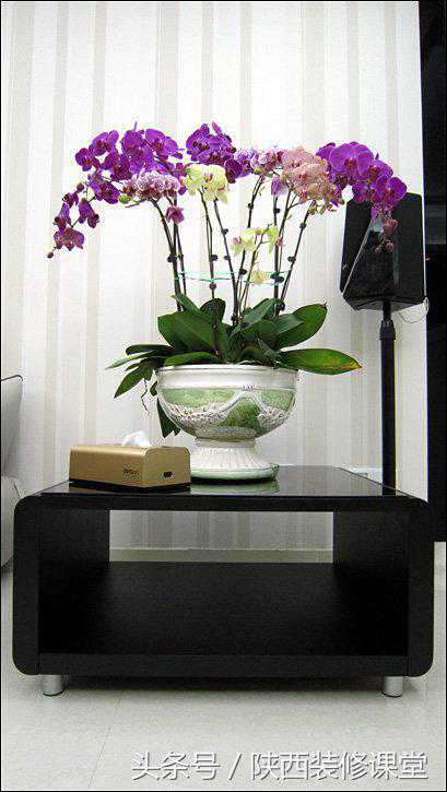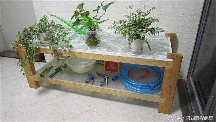 茶几上面摆几盆小的绿植,下面放整理花草要用到的工具,恰到好处。