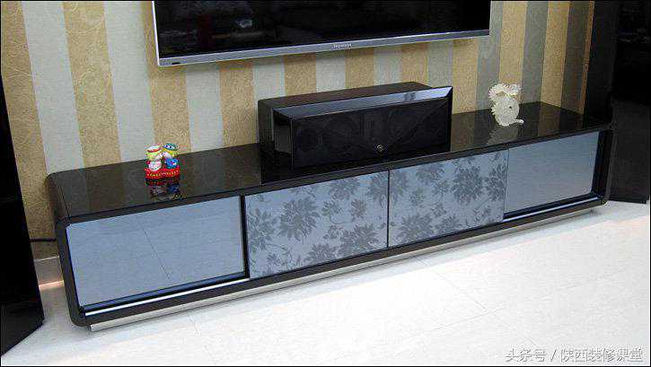 OK,回到客厅,仔细看看电视柜。台面是黑色钢化玻璃,柜体为烤漆,抽屉和拉门是灰镜,柜脚为不锈钢。