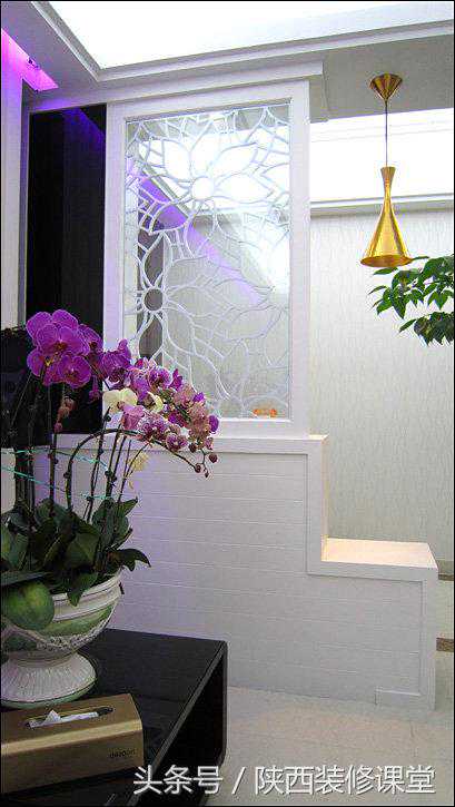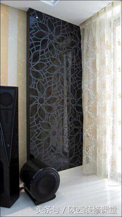 阳台门边的黑镜。这个地方是房子的承重墙,因为电视背景墙后退了十公分所以就像是突出了一根柱子,用带图案的黑镜包起来与左边玄关背景墙的白色形成鲜明的对比,大大的太阳花图案和鞋柜上的木通花一样。