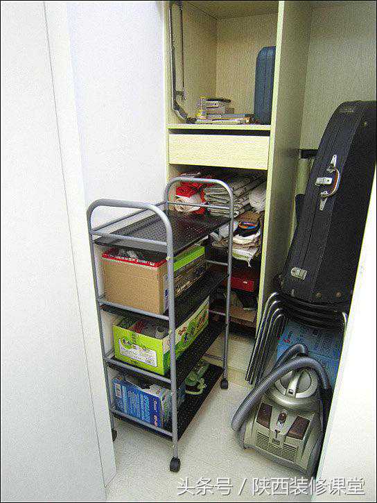左瞧瞧:一个手推车架(53*32*100),移动方便;后面的柜子里其实也是一个手推车架(40*32*75),不过轮子就卸掉了。这两个层架让储藏室可以放入更多的小物件,又不会乱成一团。
