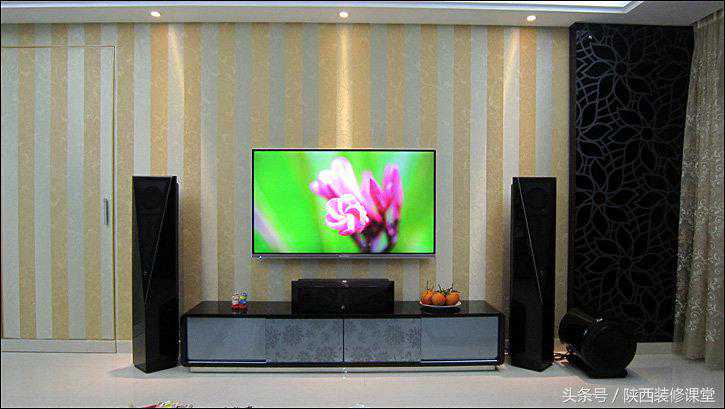 2、同样原来没有做幕布槽,又要避开壁挂的电视,所以幕布(图中黄色部分)只能用吊装电动幕。电动幕的电源初步考虑是从电视背景墙的射灯取(因为平时也基本不开)。