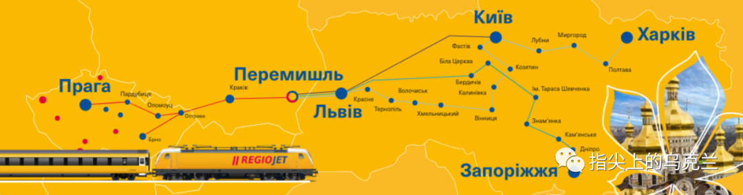 捷克铁路公司RegioJet推出了前往乌克兰的火车联程票,从布拉格到哈尔科夫、波尔塔瓦、第聂伯罗和扎波罗热,由于双方轨距不同,需要在边境城市普热梅希尔换乘。从布拉格到利沃夫的票价是20欧元。到基辅的票价为38欧元,到哈尔科夫的票价为69.2欧元,到扎波罗热的票价为70.9欧元