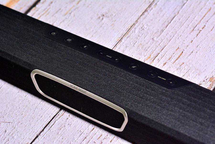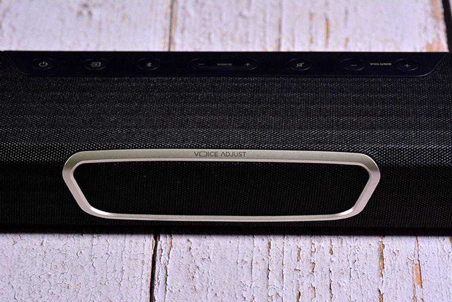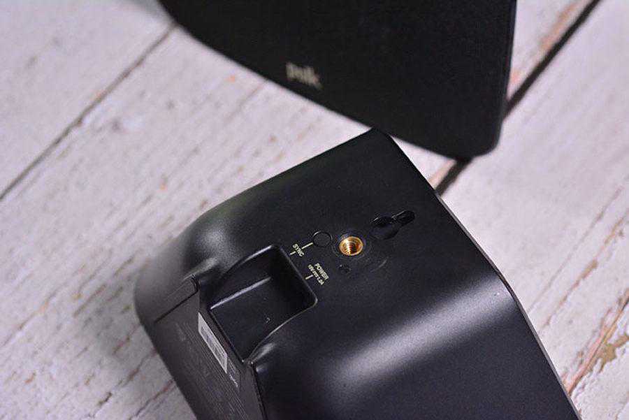 正中间的银色设计不仅仅用来作为只是增添时尚美感。它另一个身份是polk的VoiceAdjust(对白修正)技术。该项技术的主要功能是对影片中的人的声音进行单独修正调节,让我们在观影中能够更清晰的听到角色的对白。