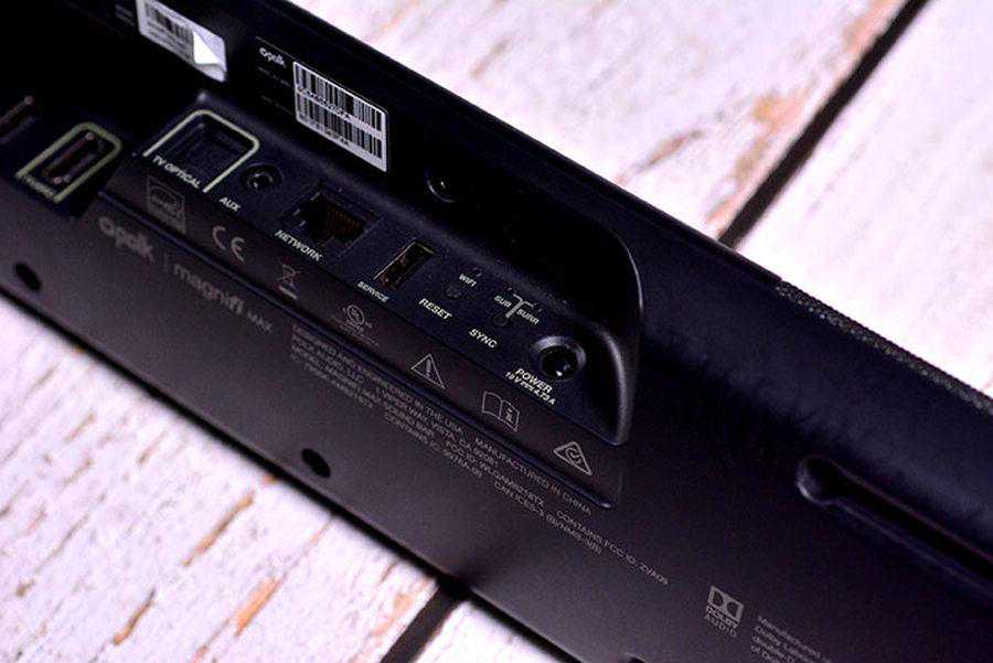 PolkMagnifiMaxSR回音壁背部接口数量丰富,3组输入HDMI、一组输出HDMI接口(输出口支持ARC协议)可以连接多款设备,此外光纤、AUX、网络端口的配备让连接方式更加丰富。SYNC键可以一键配对低音炮和卫星音箱。
