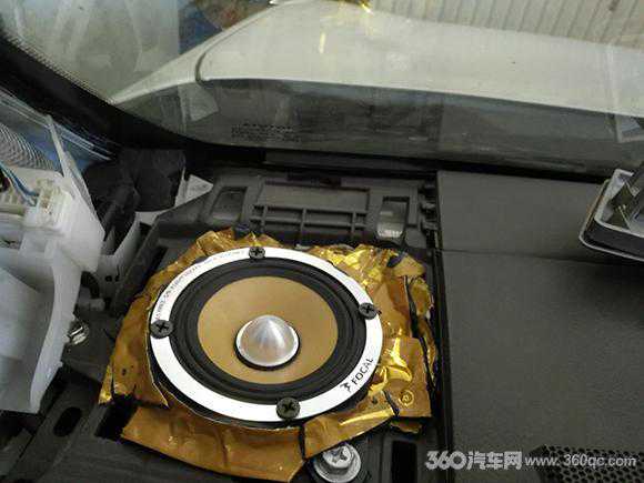 本次改装,要求是尽量不改变原车外观,讲究简洁,所以改装店的技师把法国劲浪KRX3黄盆系列的高音倒模于A柱,而中音则隐藏于仪表原高音位置。