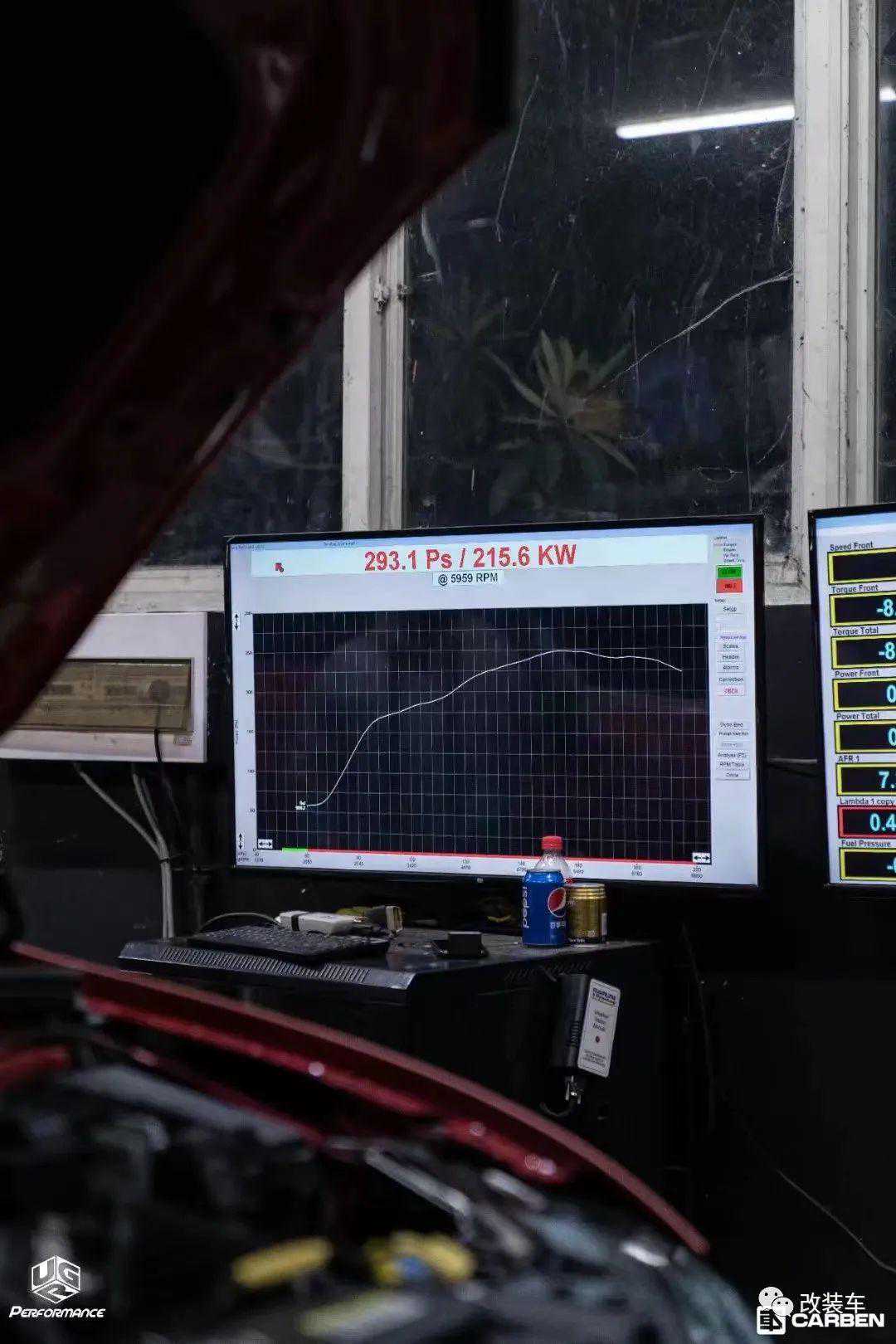 "然后接下来就是对动力方面下手了,先是换上了BOOM直通头段、KN98mm冬菇头进气、Snowtech中冷、Snowtech涡轮管、LLT90度涡轮进气管、TD开放式进气、APT酒喷、NGK7437-9火花塞、APR点火线圈、锻造油底壳,最后写入一版UGR2阶程序,做出了轮上293匹的马力!"