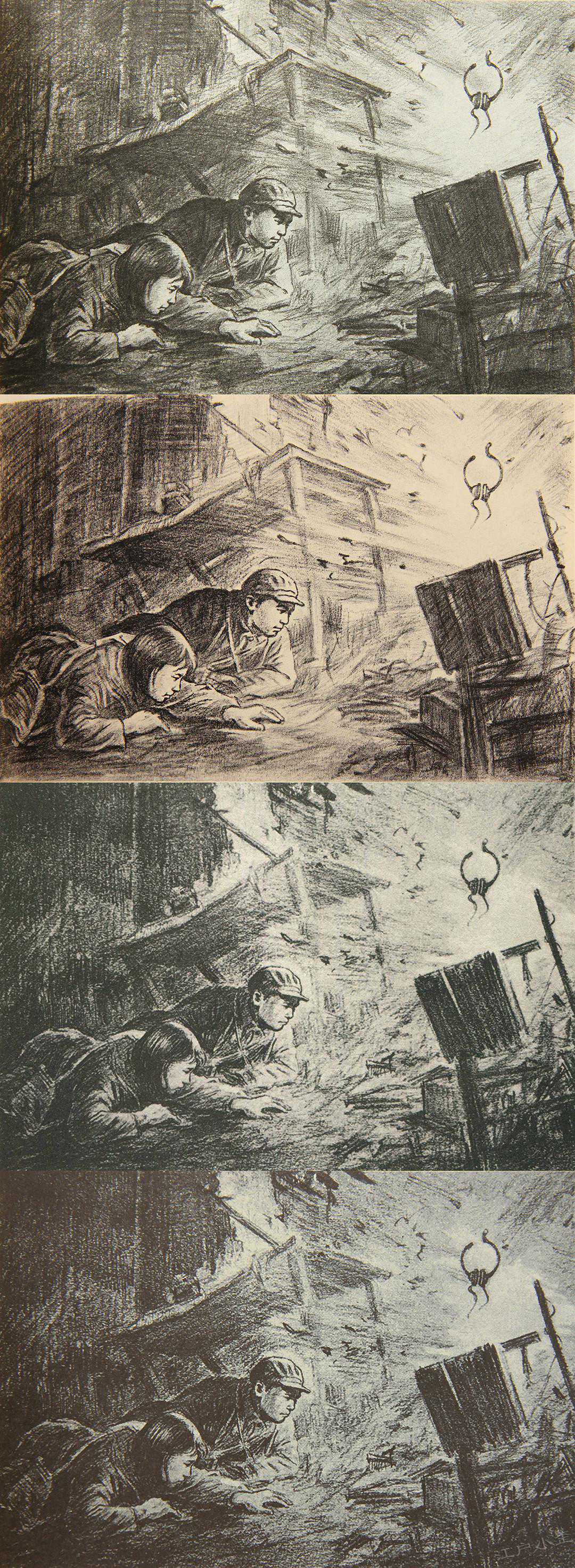 我还选了四幅顾炳鑫百年画展看到的原稿,以之和四组印刷品对比。