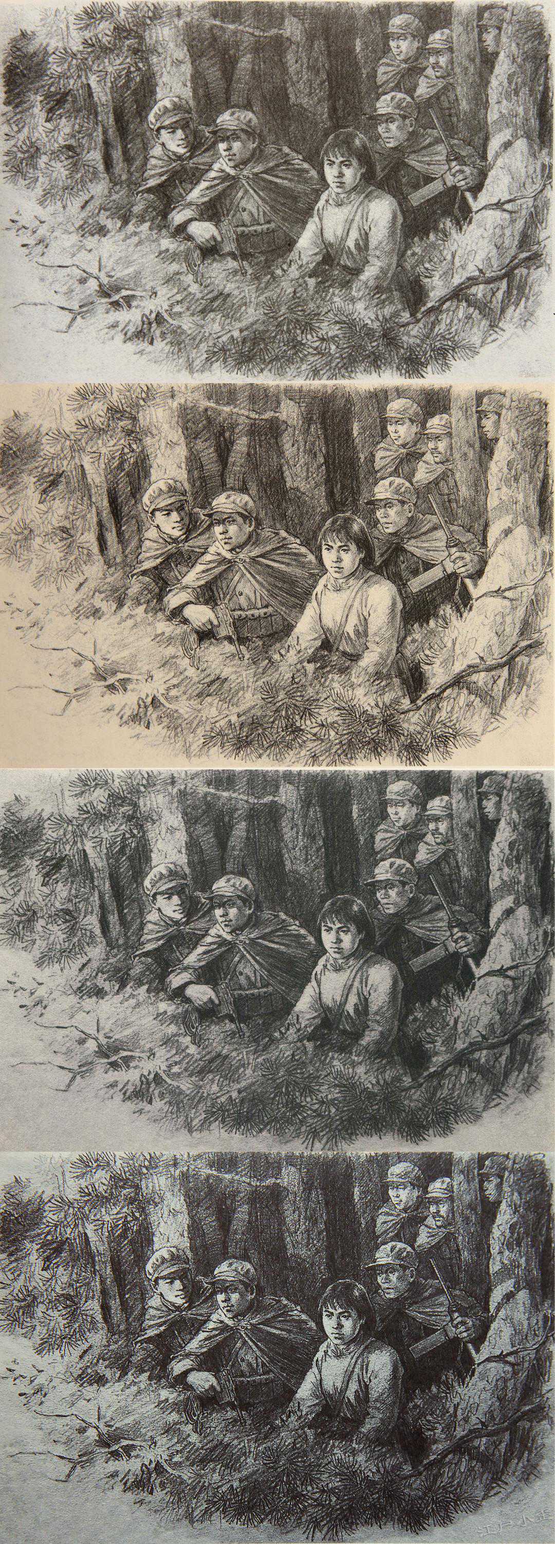 从四组出版物看,上美有些模糊,津美中规中矩,辽美印刷失败,最佳是黄大渡,主人公仿佛沐浴在胜利的阳光下,看起来暖融融的。