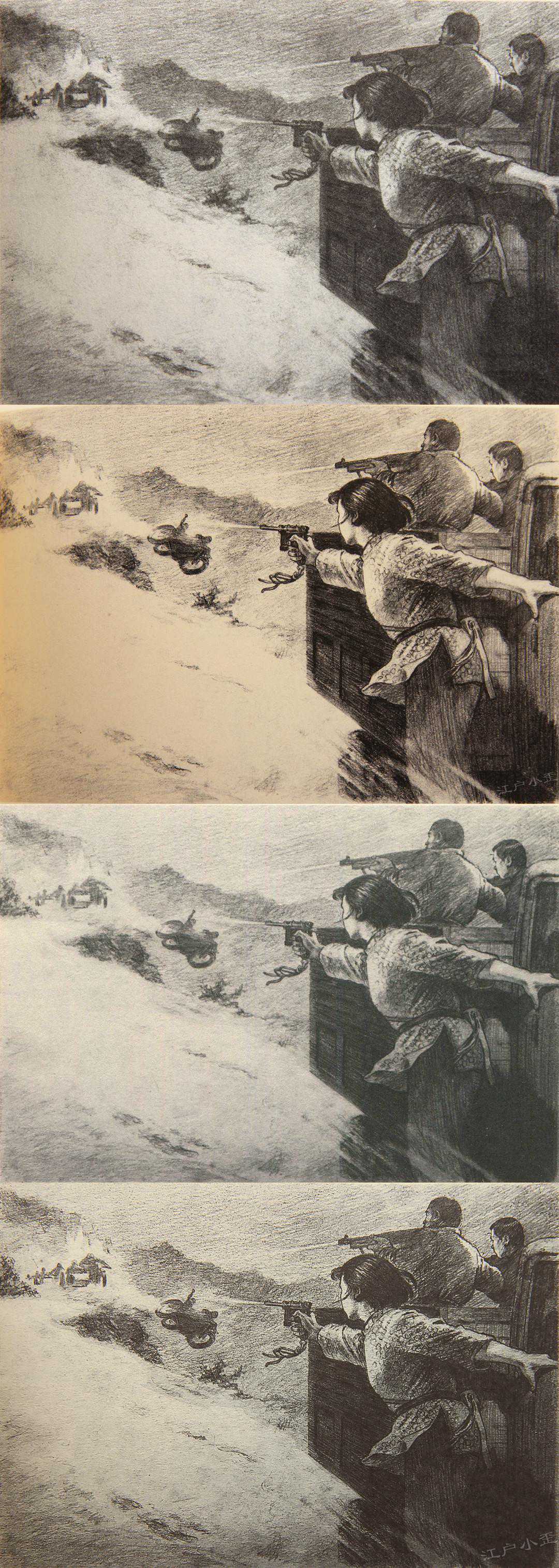 P141也品质堪忧。不过这幅图有个趣味点,剧情是说敌人炮弹打下来,报务员瞬间牺牲了,我们的男主李连长忙抱倒女主刘四姐趴在地上。大家看上美和黄大渡,二人的表情是嘴角微微上翘,似乎对炮弹早有预料,还挺开心,你俩搁这劈情操呢?旁边都有同志牺牲了啊喂。