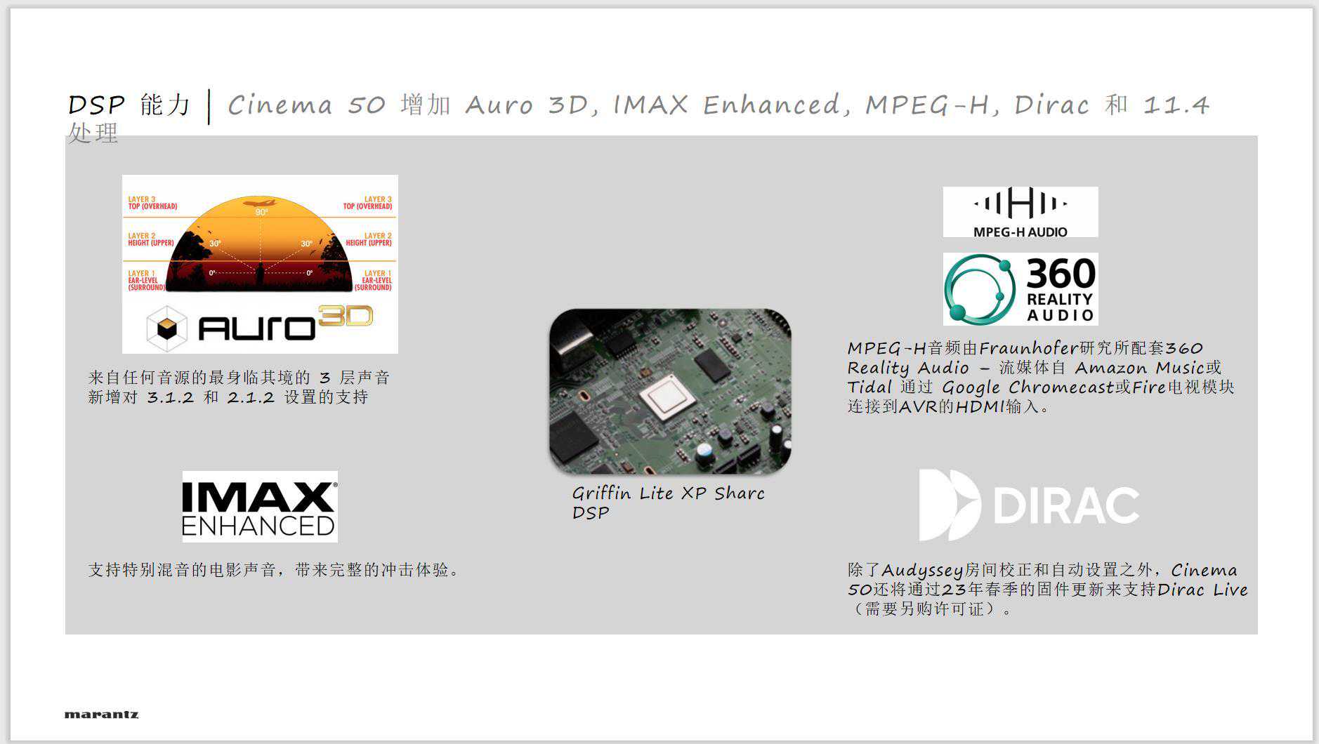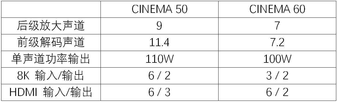 Cinema系列从50开始支持11.4声道,支持所有主流多声道解码,并在硬件上支持Dirac。