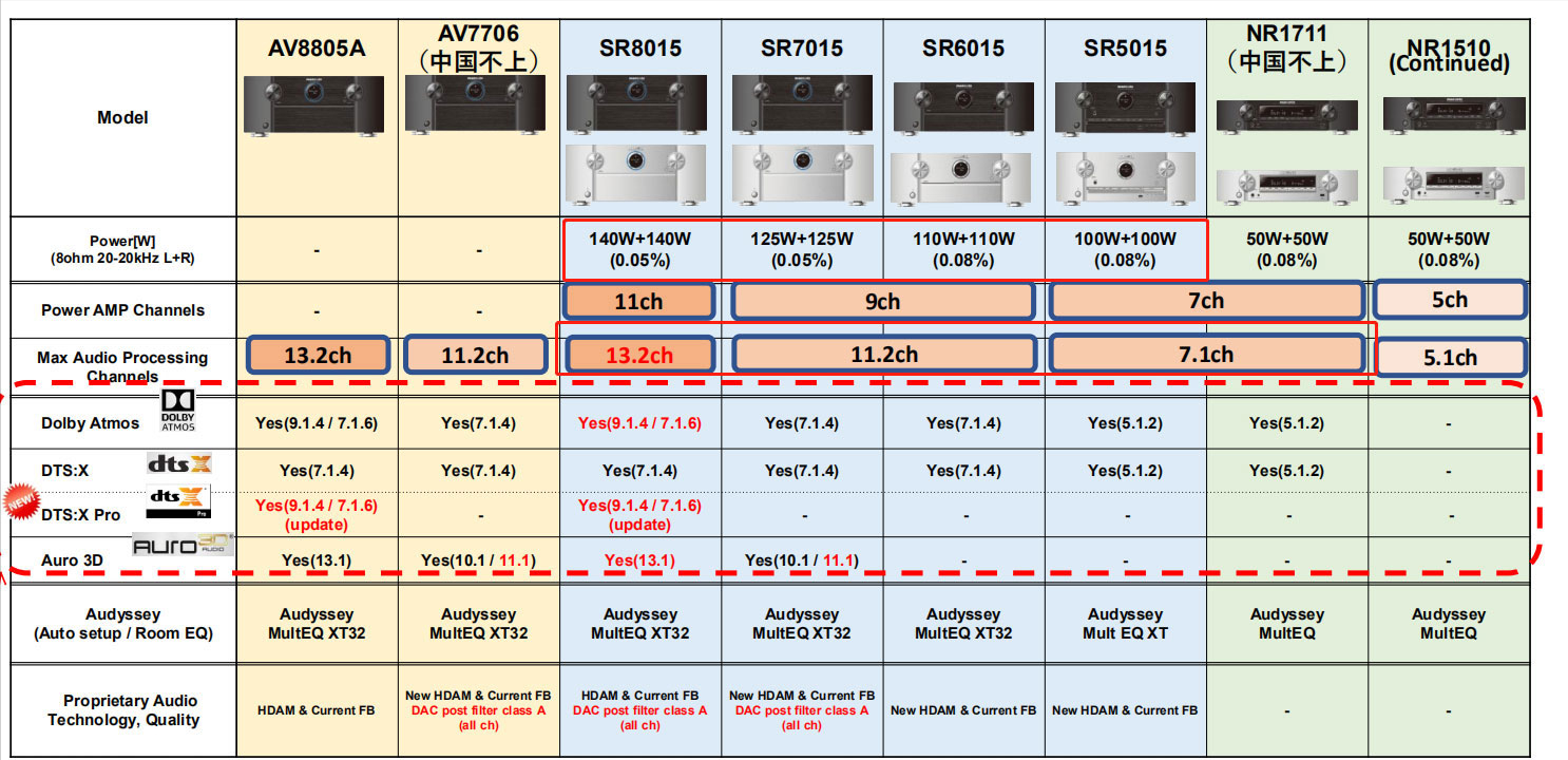 上图中我们重点看SR7015,SR6015和SR5015。SR7015,125W(FTC标准)功率输出,9声道放大,11.2声道解码。SR6015放大和解码特性与SR7015一样,功率缩水到110W。