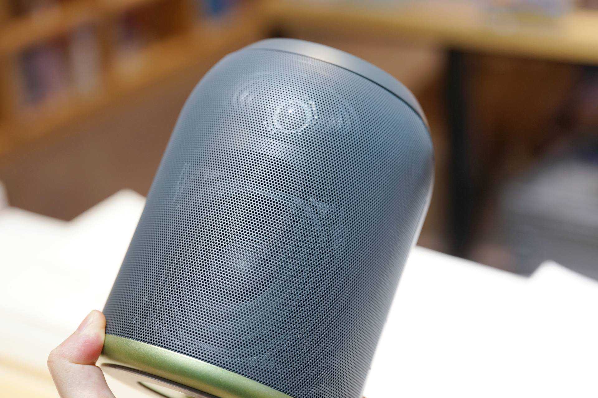 机身正面是一大片金属网罩,在强光下,内部发音单元隐约可见,这种朦朦胧胧的感觉,既神秘,又高级。其中上半部分是一个0.7″高音单元;下半部分则是一个3.5″低音单元▲