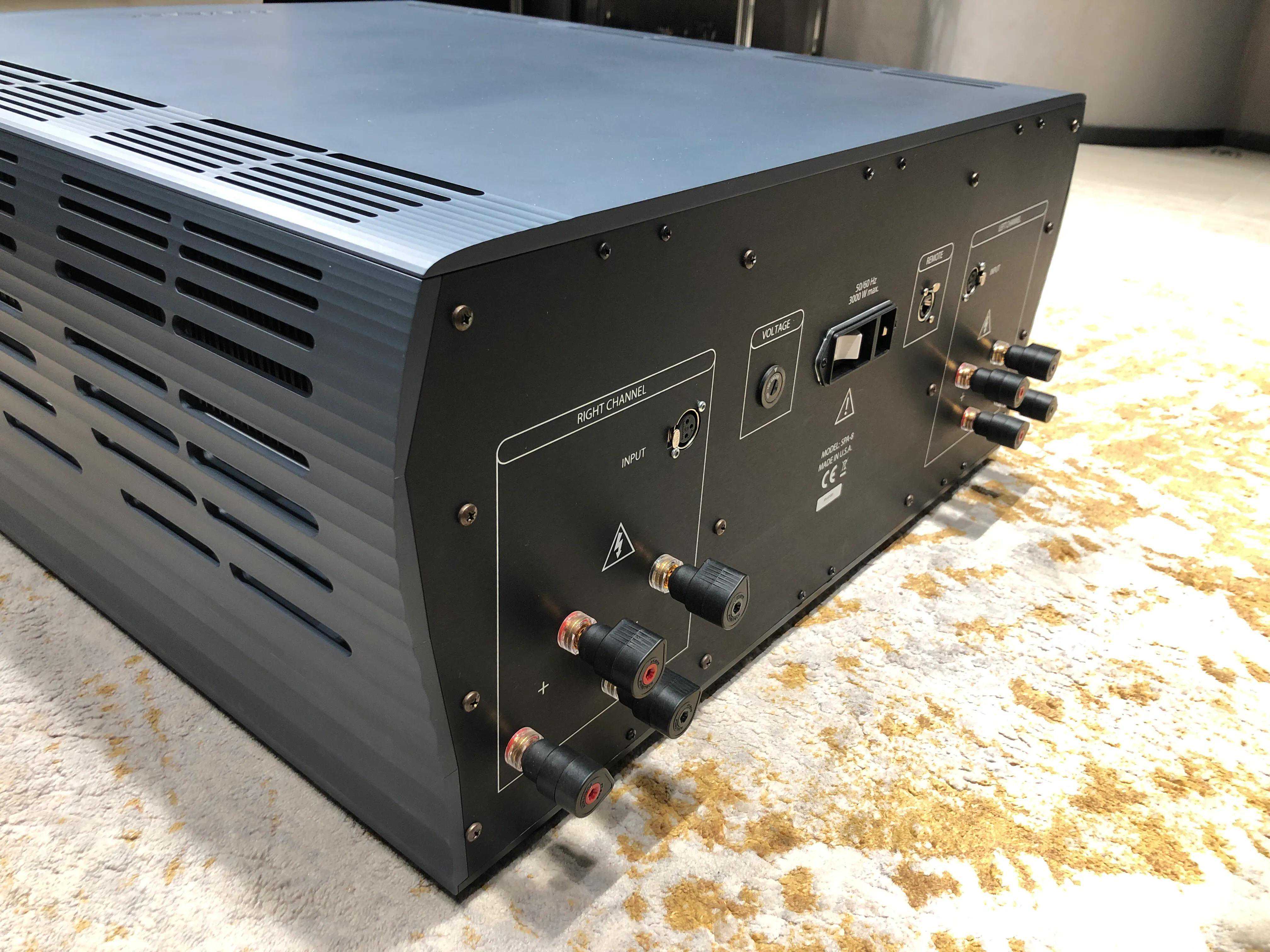 SPA-8立体声后级终于在2019年推出市场,首次亮相广州音响展,其宽:730深:830高:340mm体积,选用航天铝材加工而成机箱,表面衔接得天衣无缝,看不到一颗螺丝,其外观沿用MPS-8(梦想)系列一样圆润流畅线条,灰蓝色色彩,均匀细腻,其工艺水平,足以证明徳国人严谨!重量高达130公斤!搬动需四个人协作。