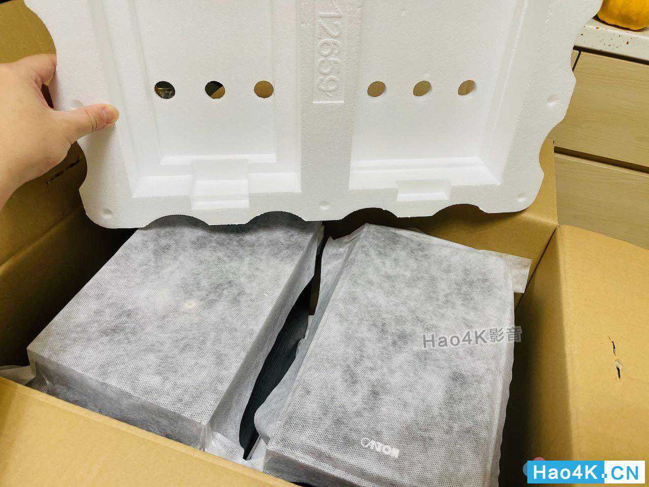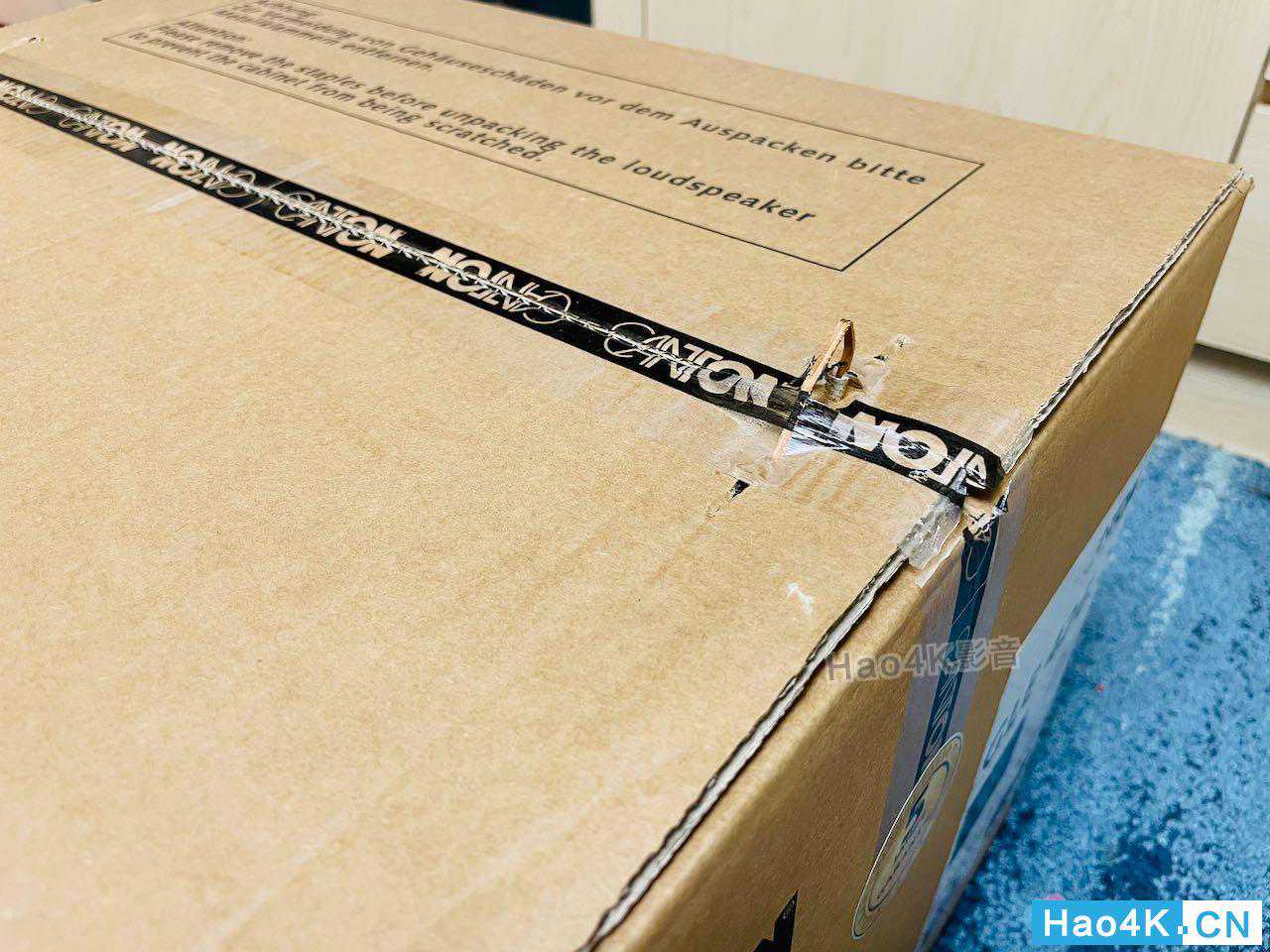 ▲下订后没多久社区管理室就通知有货品送来了,赶快搬上楼。要过年了,趁着周休假期就来把客厅的音响系统搞定吧!外箱采用单一箱的设计,也就是两支音箱都放在里面,这就是的外箱,包装非常扎实。