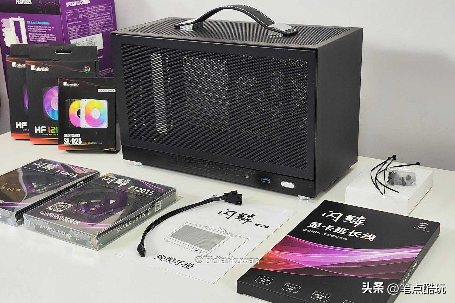 机箱配件全家福:除了基础配件螺丝、扎带、两把闪麟风扇和一根4Pin二合一供电线,闪麟S400还送了一根质量很高的显卡延长线。