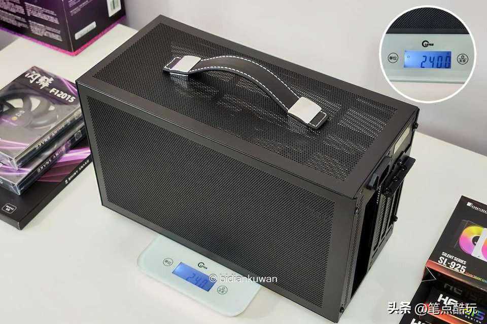 黑色机箱比较低调,三围340x220x140mm,容量浓缩到10.8升,侧面看是A4纸的大小。上秤重量2.4千克,板材用料扎实,皮质提手手感不错,重要的是结实与美观兼顾,拎着走也放心。